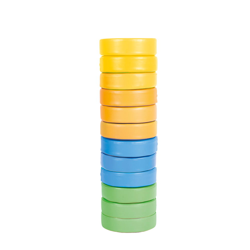Besonderen Wert haben wir auf den Sitzkomfort und die Materialqualität der Kissen gelegt. Die zwölf runden Kissen sind mit einem widerstandsfähigen Schaumstoff gefüllt. Diese acht Zentimeter dicke Polsterung federt sanft ab und schützt die Kinder zuverlässig vor unangenehmer Bodenkälte. Umhüllt wird der Schaumstoff von einem hochwertigen Kunstlederbezug. Dieses Material ist äußerst robust, schwer entflammbar und komplett phthalatfrei – Eigenschaften, die höchste Sicherheit beim Spielen gewährleisten. Zudem ist der Bezug stark schmutzabweisend und lässt sich bei Bedarf einfach mit einem feuchten Tuch abwischen. So stellen Sie eine dauerhaft hygienische Umgebung sicher. Die harmonischen Pastelltöne, von denen jeweils drei Kissen pro Farbe im Set enthalten sind, fügen sich dezent in jeden Raum ein und schaffen eine beruhigende Atmosphäre.