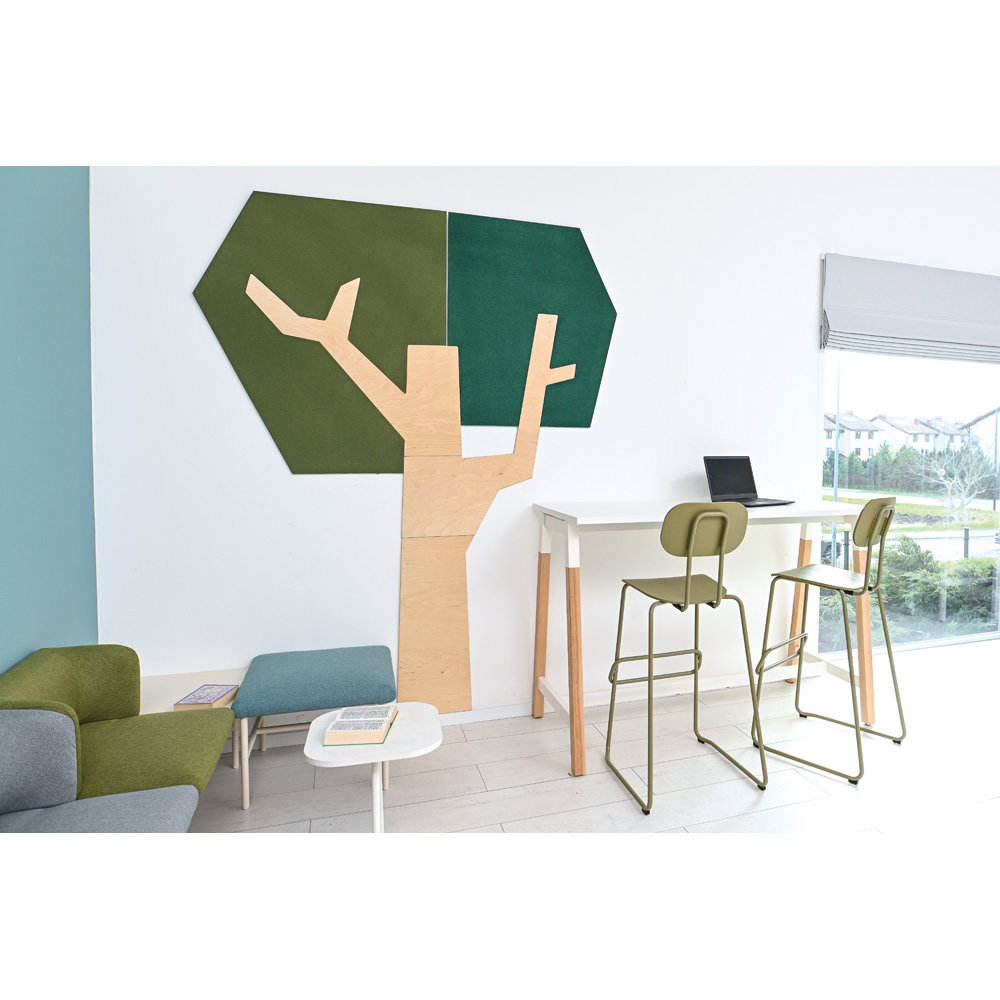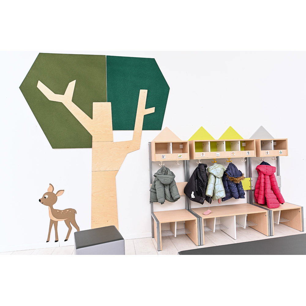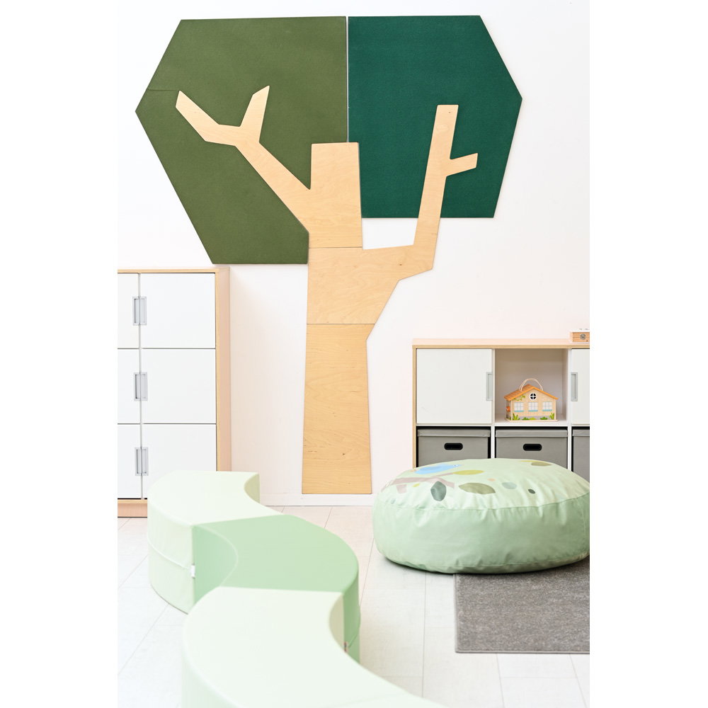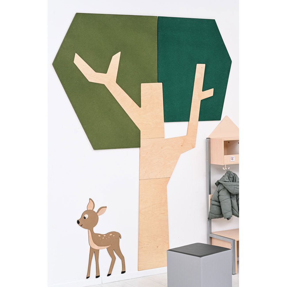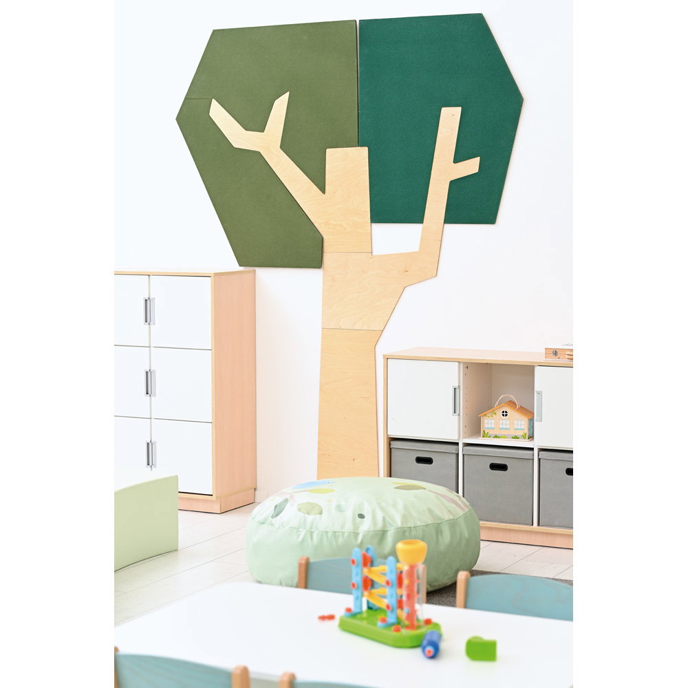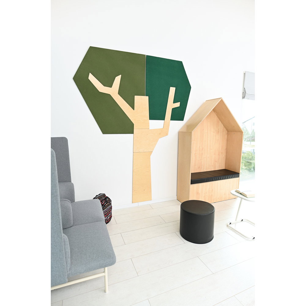 Setzen Sie ein architektonisches Statement und verbessern Sie gleichzeitig das Raumklima. Die Wandapplikation „Baum mit eckiger Krone“ ist ein außergewöhnliches Gestaltungselement, das modernes Design mit funktionaler Raumakustik auf beeindruckende Weise verbindet. Mit seiner klaren, geometrischen Form und einer imposanten Höhe von fast 2,5 Metern wird dieser Baum zum stilvollen Mittelpunkt in Eingangsbereichen, Fluren, Büros oder modernen Lernlandschaften. Er schafft eine einzigartige Verbindung von Natur-Assoziation und zeitgenössischer Ästhetik und wertet jeden Raum sowohl optisch als auch funktional auf.