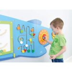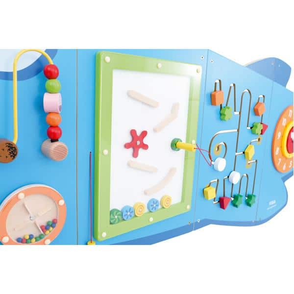 Tafel in freundlicher Form mit Spielen, die den Tastsinn stimulieren und die motorischen Fähigkeiten entwickeln, interessante Farbeffekte wecken die Aufmerksamkeit der Kinder, einige Elemente erzeugen Geräusche. Montageelemente enthalten.