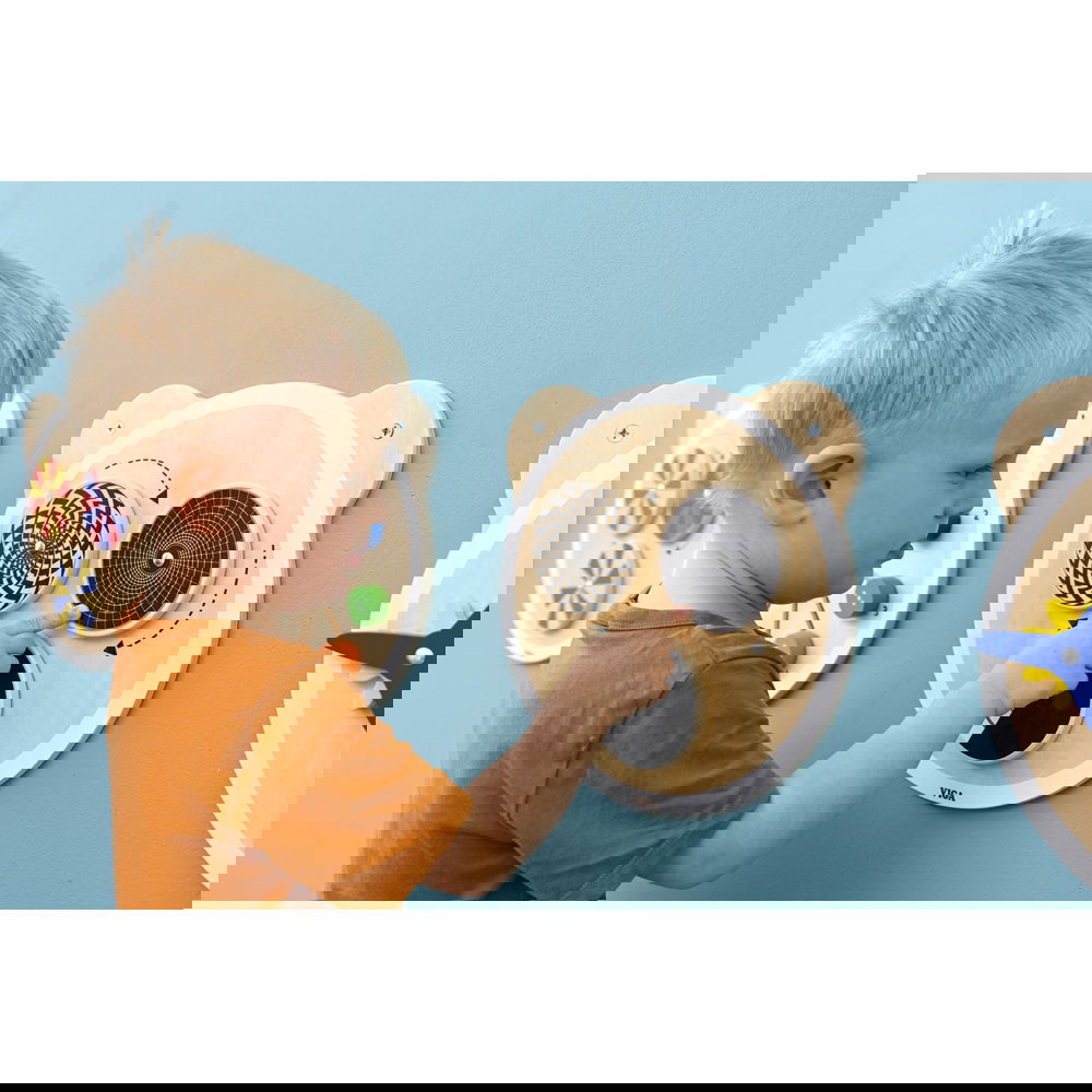 Gefertigt aus natürlichem, robustem Holz, bringt der Bärenkopf nicht nur einen pädagogischen Mehrwert, sondern auch eine warme und einladende Optik in Ihre Räume. Das zeitlose Material hält intensiver Nutzung stand und fügt sich harmonisch in jede kindgerechte Umgebung ein. Mit seinen kompakten Maßen von 30 x 30 x 3 cm findet dieses Motorikspielzeug selbst in kleinen Kinderzimmern, schmalen Fluren oder gemütlichen Wartebereichen problemlos seinen idealen Platz. Dank der festen Wandmontage – das benötigte Montagematerial mit passenden Schrauben ist bereits im Set enthalten – bleibt der Boden immer frei von losen Spielteilen. So schaffen Sie eine dauerhaft sichere, ordentliche und sofort zugängliche Spielumgebung. Bieten Sie den Kindern eine sinnvolle Beschäftigung, die Konzentration und Wahrnehmung gleichermaßen fördert.