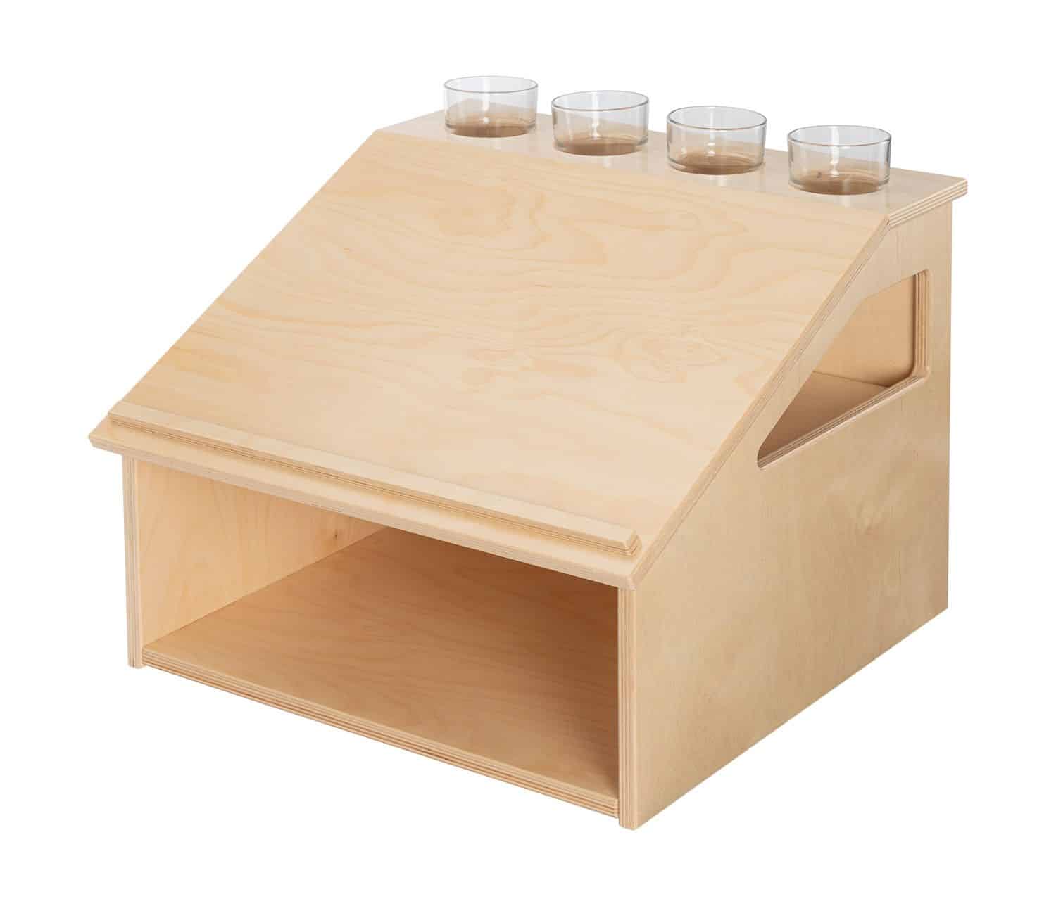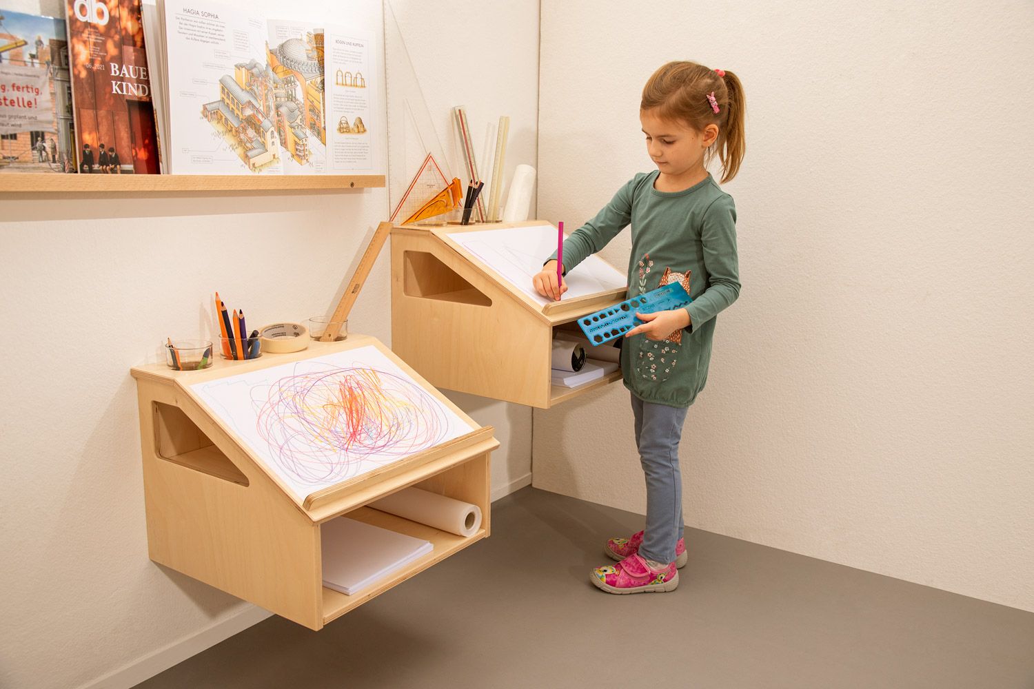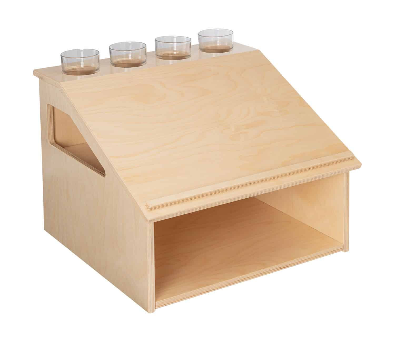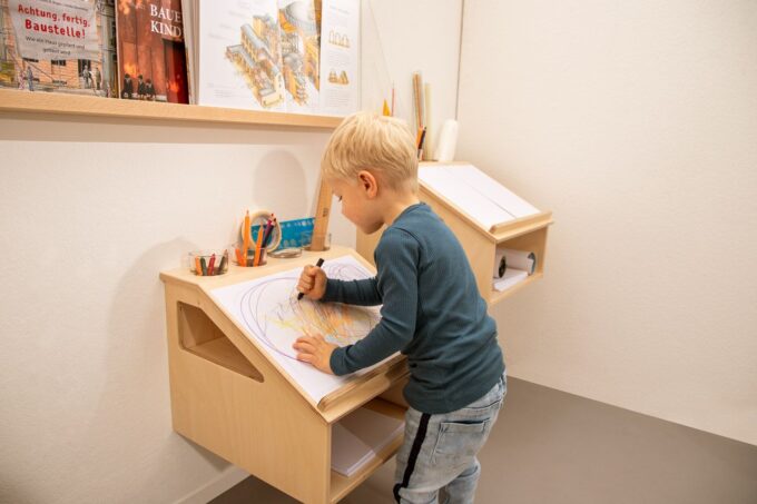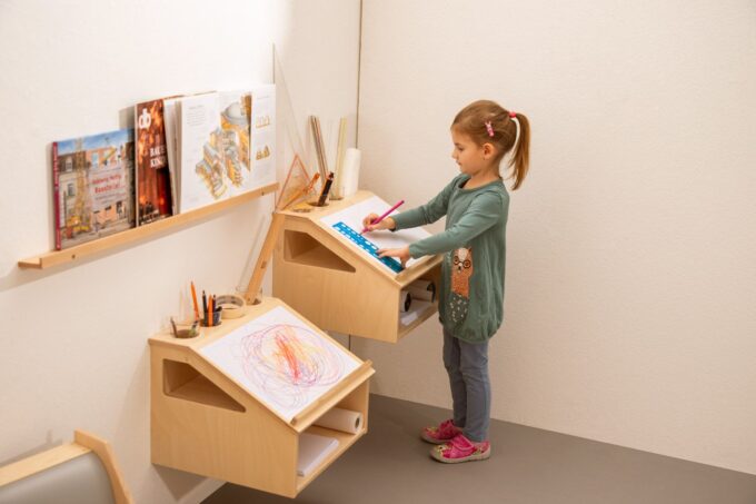 - Ausstattung: Schräge Arbeitsfläche für zwei A4-Bögen (hochkant) oder A3 (quer), 4 Öffnungen für Schreibwerkzeuge, unterer Stauraum für Papier oder Materialkästen