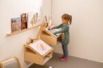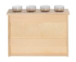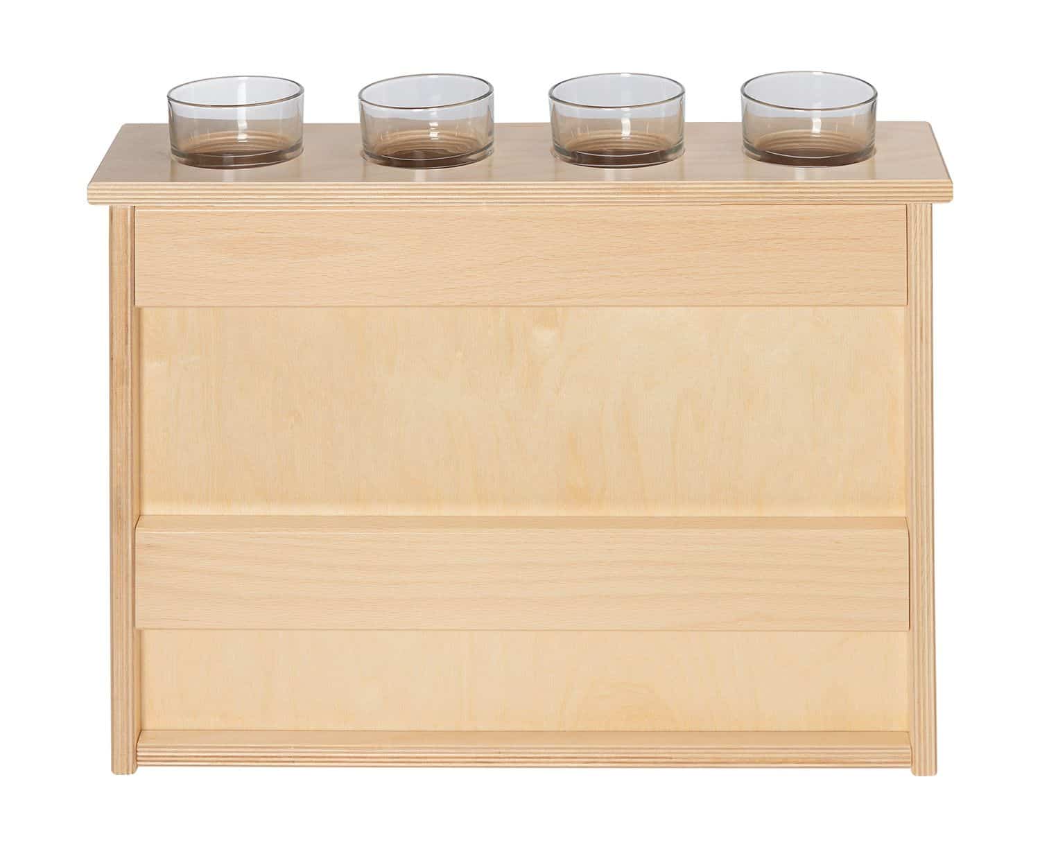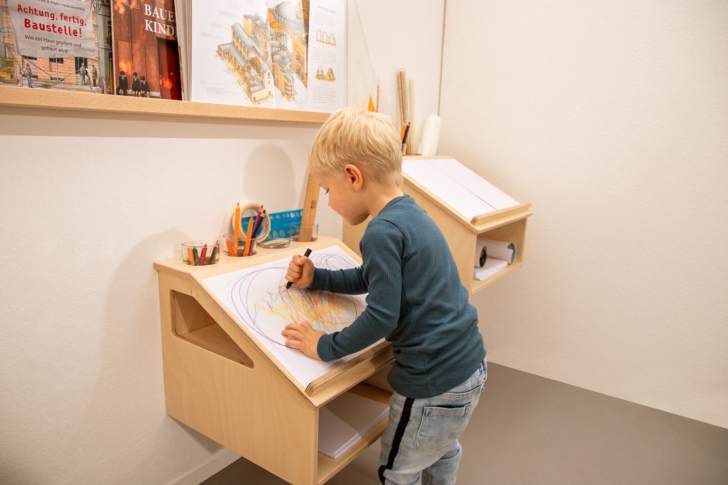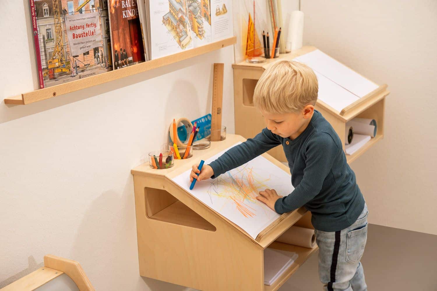 - Ausstattung: Schräge Arbeitsfläche für zwei A4-Bögen (hochkant) oder A3 (quer), 4 Öffnungen für Schreibwerkzeuge, unterer Stauraum für Papier oder Materialkästen