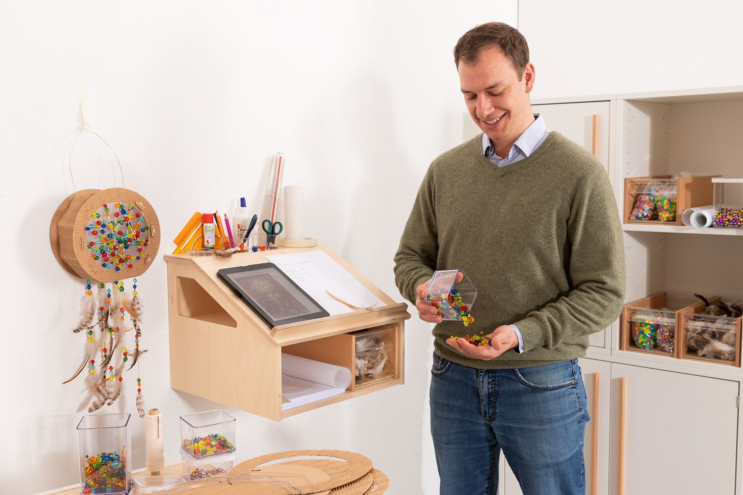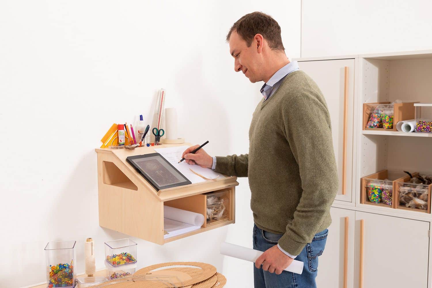 Der vielseitige Wandarbeitsplatz bietet eine geneigte Arbeitsfläche, die perfekt ist für Schreib- und Zeichenarbeiten. Dank der vier Öffnungen im oberen Bereich haben Sie immer Ordnung und alle Schreibwerkzeuge griffbereit in den mitgelieferten Stapelgläsern aus Hartglas. Der untere Stauraum bietet Flexibilität zur Aufbewahrung von Papier oder Materialkästen, die separat bestellt werden können.