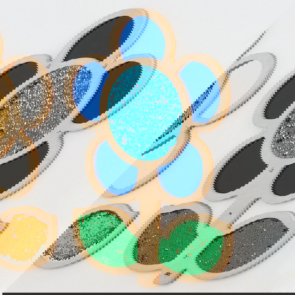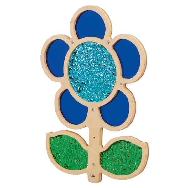 Die zweifarbigen Wendepailletten laden dazu ein, immer wieder über sie zu streichen und das Farbspiel zu genießen. Spielerisch wechseln die Pailletten ihre Farbe und bieten den Kindern ein faszinierendes und intensives sensorisches Erlebnis. Die Blütenmitte und Blätter sind mit diesen zauberhaften Pailletten versehen, während die Blütenblätter aus Acrylglas als Spiegel verwendet werden können, in denen sich die Kinder selbst entdecken.