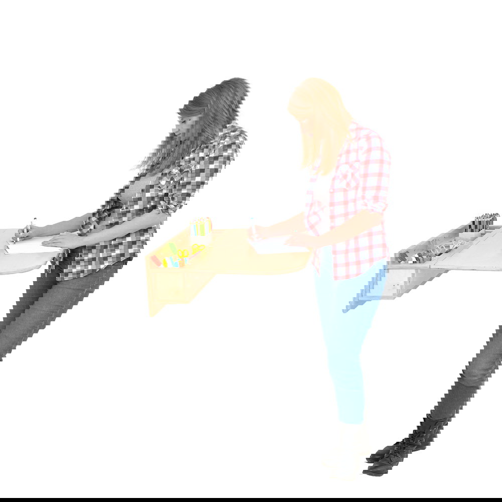 Gefertigt aus robustem, lackiertem Birke-Sperrholz, strahlt das Pult Natürlichkeit und Stabilität aus. Doch es ist nicht nur eine Schreibunterlage: Im aufgeklappten Zustand offenbart es ein durchdachtes Ordnungssystem. Vier integrierte Fächer bieten Platz für Stifte, Notizblöcke, Smartphones oder andere Kleinigkeiten, die sonst auf der Arbeitsfläche stören würden. Besonders hervorzuheben ist die umweltfreundliche Lackierung auf Wasserbasis. Sie sorgt dafür, dass von Anfang an keine unangenehmen Gerüche oder Schadstoffe ausdünsten – ideal für sensible Umgebungen wie Schulen oder Kinderzimmer.