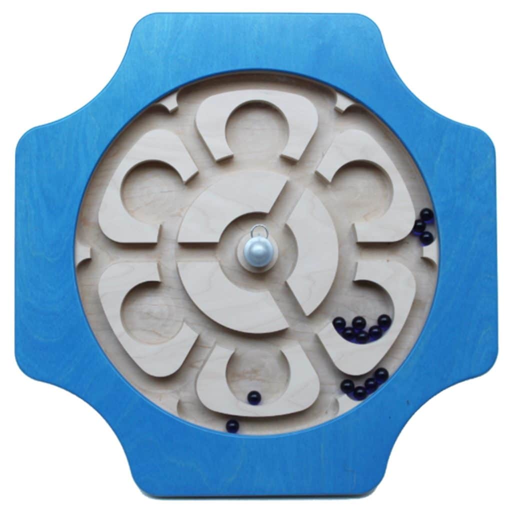 Das Labyrinth gleicht einer Blume, die sich um ihren Mittelpunkt dreht. Das Wandspiel ist gefüllt mit blauen Glasmurmeln, die sich je nach Drehbewegung rechts oder links herum, ihren Weg durchs Labyrinth suchen. Die Kinder werden dabei sicher interessante Spielideen finden. Das Kugelspiel wird auf einen Metallbolzen sicher an der Wand befestigt.