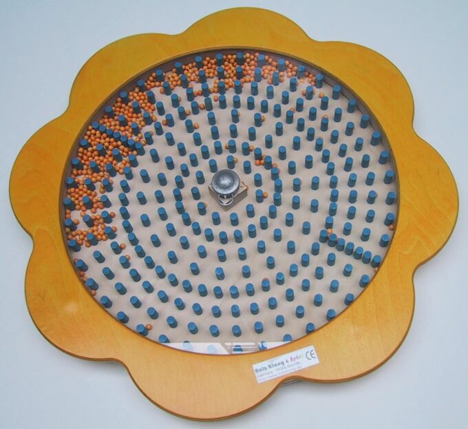 Durch Drehen des Wandspieles um die eigene Achse, folgen kleine Kunststoffkügelchen hinter einer Plexiglasscheibe ihren Lauf. Im Verlauf werden sie durch kleine blaue Holzstifte gebremst und erzeugen ein angenehmes und beruhigendes Regengeräusch. Dieses Spiel fordert Kinder und Erwachsene zum Ausprobieren auf und fördert genaues Beobachten. Das Kugelspiel wird auf einen Metallbolzen sicher an der Wand befestigt.