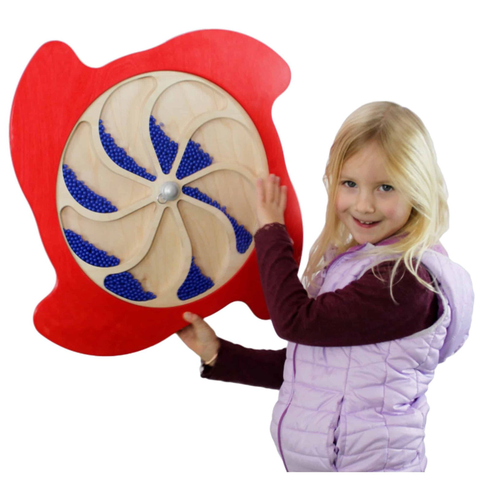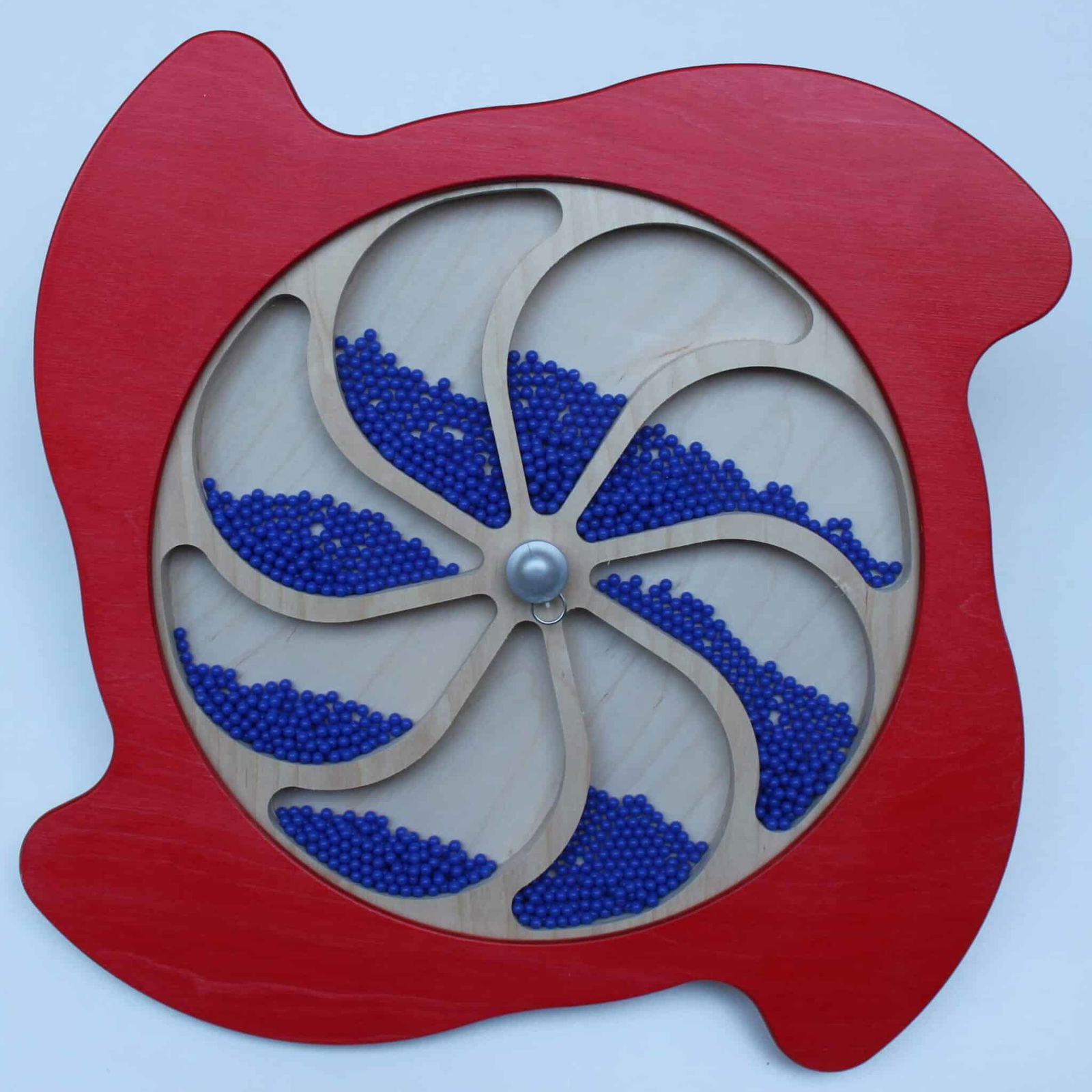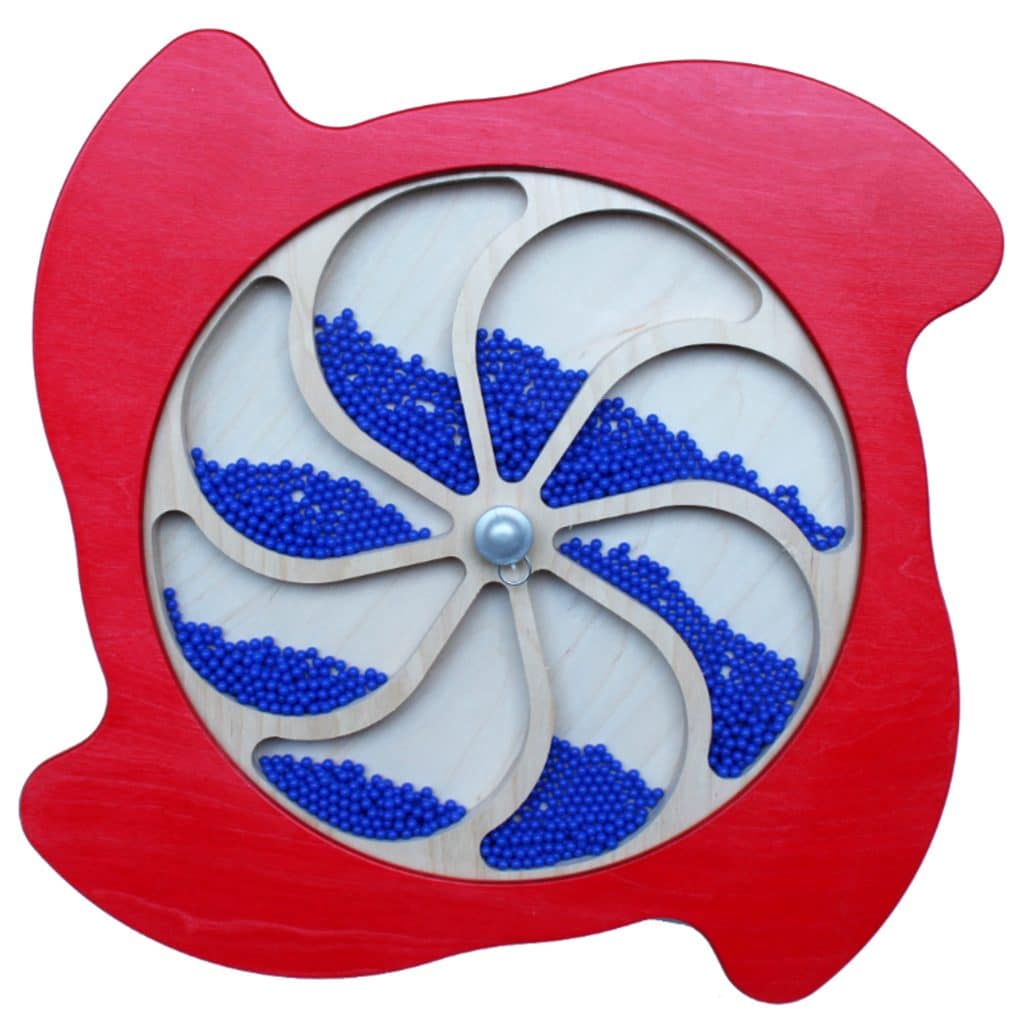 Das attraktive Spiel mit Drehmechanismus ist nicht nur ein Spielgerät, sondern auch sehr dekorativ in Wartebereichen oder dergleichen. Sobald sich das Rad dreht, kommen die kleinen Kügelchen in Bewegung. Ist das Rad ständig in Bewegung, entsteht ein Rauschen wie bei einem Wasserrad, das dem Perpetuum Mobile von Leonardo da Vinci ähnelt. Das Kugelspiel wird auf einen Metallbolzen sicher an der Wand befestigt.