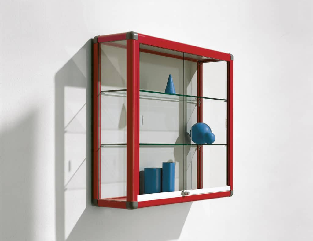 Aluminiumvitrine mit 2 verstellbaren Dickglasböden, Flächenbelastung je Glasboden 25 kg. Die Glasschiebetüren sind geführt durch einen leichtlaufenden Alu-Rollbeschlag. Druckzylinderschlösser sorgen für Sicherheit. Alle Scheiben sind zudem aus Sicherheitsglas hergestellt. Unsere Vitrinen werden standardmäßig natureloxiert geliefert. Sie können Sie aus 15 verschiedenen RAL-Farben wählen.