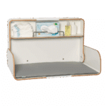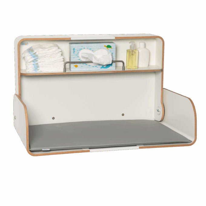 Der robuste Wandwickeltisch kann platzsparend und flexibel in jeder gewünschten Höhe angebracht werden. Eine Wandaufhängeplatte wird mitgeliefert. Durch die klappbare Wickelplatte ist der Wickeltisch extrem platzsparend und kompakt. Im geschlossenen Zustand hat der Wickeltisch eine Tiefe von 22,5 cm, geöffnet nur 49 cm! Platz für Windeln und Pflegeartikel bietet ein eingebauter Regalboden.