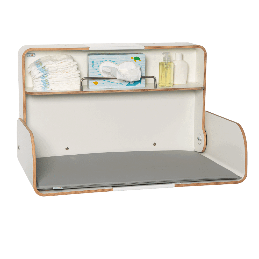 Eingebaute Klappenbremsen sorgen dafür, dass die Wickelplatte nicht ruckartig herabfallen kann. Mit nur einem Handgriff können Sie KAWAform midi ganz einfach öffnen und wieder schließen. Eltern können so den Wickeltisch auch allein, mit Baby auf dem Arm, benutzen. Bis 50 kg kann der Wickeltisch belastet werden. Alle Funktionen und Materialien von timkid Wickeltischen sind nachhaltig produziert und TÜV-geprüft. Wir fertigen unsere Produkte ausschließlich in Deutschland.