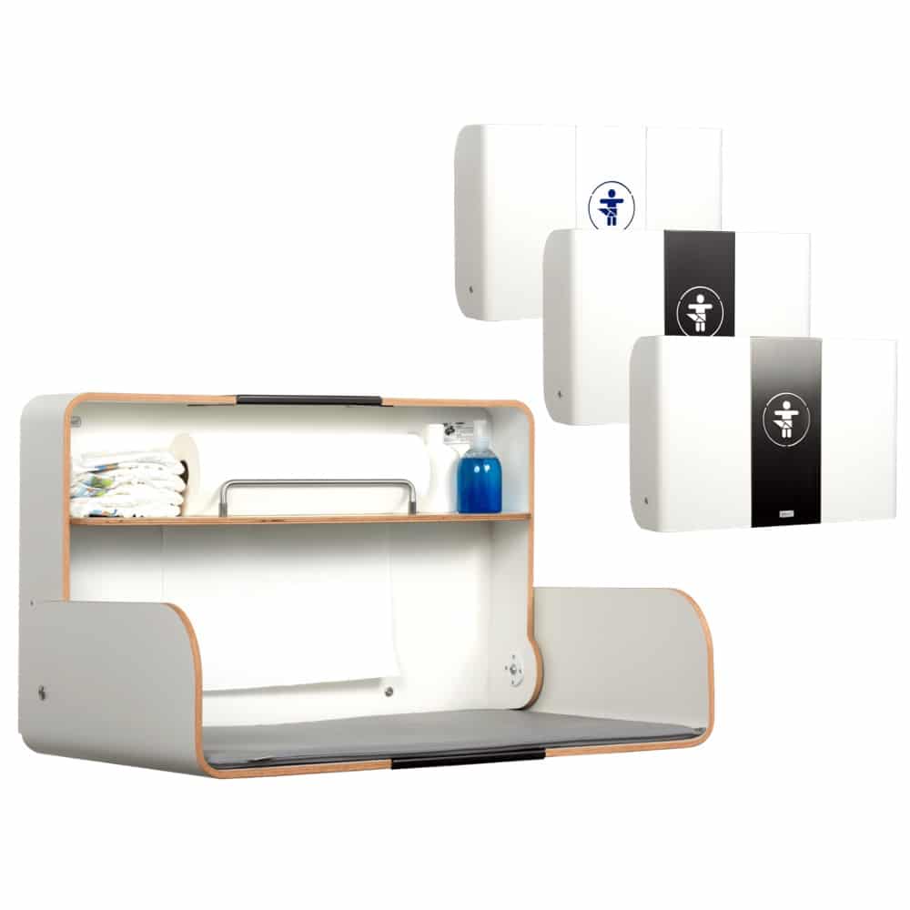 Die horizontale Variante unserer Wickeltischserie aus hochwertigem Formholz mit einem Mittelteil aus Metall ist ideal für Kunden-WCs sowie für beengte Sanitärräume. KAWAQ ragt nur bei Benutzung in den Raum hinein und wird dann wieder zugeklappt und ist ein attraktiver Blickfang für die Wickelstation im öffentlichen Raum, egal ob Café, Arztpraxis, Hotel oder Restaurant.