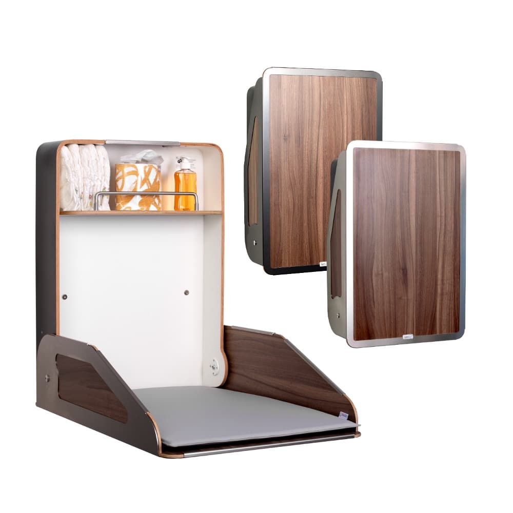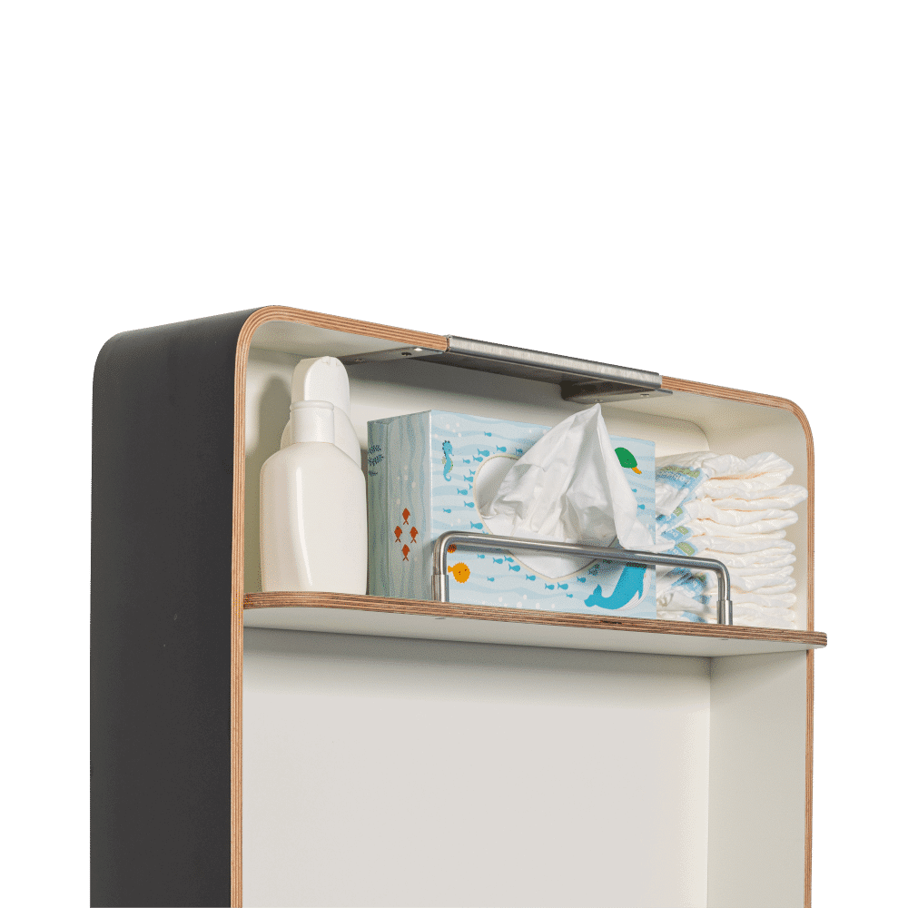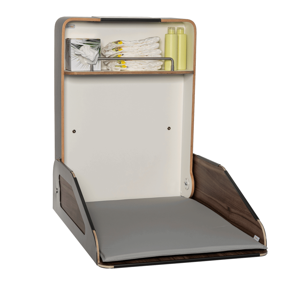 Der Wandwickeltisch Quattro besticht durch seine Metalleinfassung in Edelstahl, anthrazit oder weiß bepulvert, die besonders individuell gestaltete Fronten in Szene setzt.