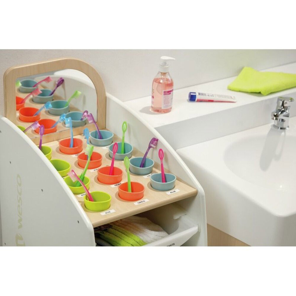 Die Ausstattung lässt keine Wünsche offen und motiviert die Kinder zur selbstständigen Körperpflege. Ein bruchsicherer Kunststoffspiegel auf kindgerechter Höhe weckt das Interesse und hilft den Kleinen dabei, ihre Putztechnik genau zu beobachten. Das Set umfasst zudem zwölf farbenfrohe Zahnputzbecher, deren Farben Sie ganz nach Ihren Wünschen auswählen können. Zwei flache Verstaubehälter (9,5 Zentimeter Höhe) und ein tiefer Behälter (20 Zentimeter Höhe) bieten reichlich Platz für Zahnbürsten, Zahnpasta und weitere Pflegeartikel.
