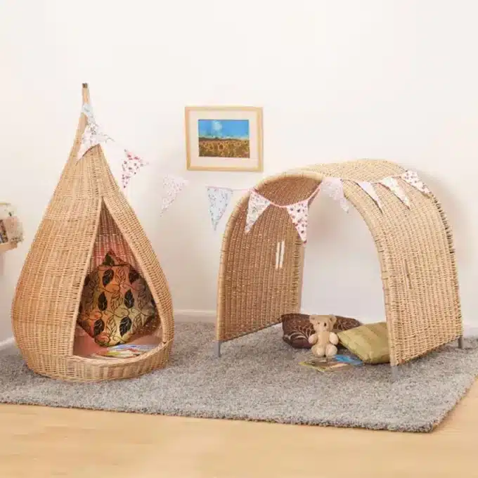 Ob für aufregende Rollenspiele, eine gemütliche Leseecke oder einen ruhigen Rückzugsort – das „Raumecke“-Set ist die perfekte Wahl für Schulen, Kindergärten oder das heimische Kinderzimmer. Die warmen, natürlichen Töne des Weidengeflechts fügen sich harmonisch in jede Umgebung ein, während das stabile Design den aktiven Alltag mühelos übersteht.