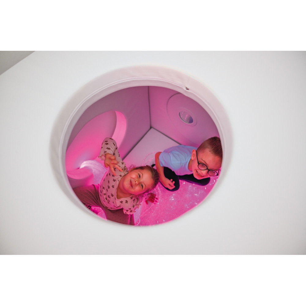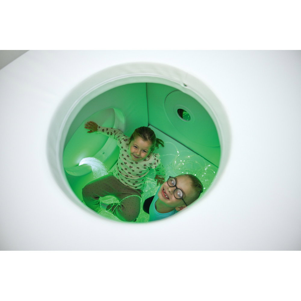 Für ein angenehmes Raumklima sorgt eine dezente Öffnung im Dach. Sie gewährleistet eine kontinuierliche Luftzufuhr und verhindert ein Gefühl der Enge. Zudem bietet diese Öffnung die kreative Möglichkeit, sensorische Elemente wie Mobiles oder Lichtleiter anzubringen, um die Atmosphäre im Inneren noch magischer zu gestalten. Der pflegeleichte und hygienische Kunstlederbezug aller Teile ist ein weiterer Pluspunkt im anspruchsvollen Alltag. Er lässt sich mühelos feucht abwischen und sorgt für eine dauerhaft einladende und saubere Spielumgebung.