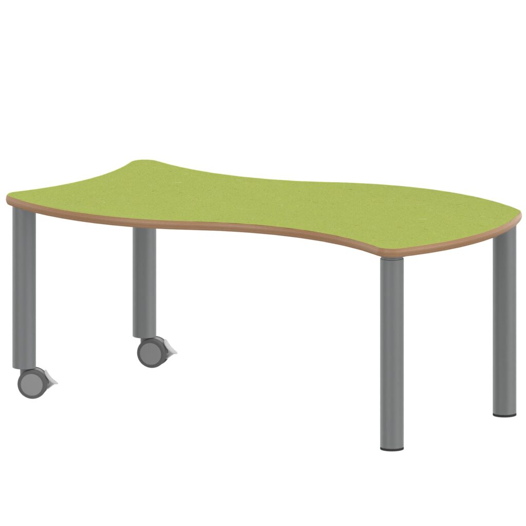 Der Wellen-Rechtecktisch ZALOTTI 120×60 cm mit Schichtstoff-Belag und fahrbaren Stahlrohrbeinen setzt neue Maßstäbe für moderne Arbeits- und Lernumgebungen durch die geniale Kombination aus organischer Wellenform-Geometrie und cleverer Mobilität. Diese außergewöhnliche zargenlose Tischkonstruktion mit unzerstörbarem 0,8 mm HPL-Schichtstoffbelag und robusten, pulverbeschichteten Stahlrohrbeinen schafft völlig neue Dimensionen für flexible Gruppenarbeit und spontane Raumgestaltung. Die besondere Wellen-Rechteckform mit 120×60 cm Systemmaß (Stellfläche 126,7×76 cm) und zwei integrierten Rollen ermöglicht müheloses Verschieben für spontane Raumrekonfiguration bei gleichzeitig komfortablem Arbeitsplatz für mittlere Gruppen. Die zargenlose Bauweise bietet ungehinderte Beinfreiheit für alle Nutzer – auch für Rollstuhlfahrer. Mit acht verfügbaren Höhen von 25 bis 76 cm wächst dieser „Made in Germany“ Qualitätstisch flexibel mit den Anforderungen mit und schafft durch seine industrielle Ästhetik eine professionelle, moderne mobile Arbeitsatmosphäre.