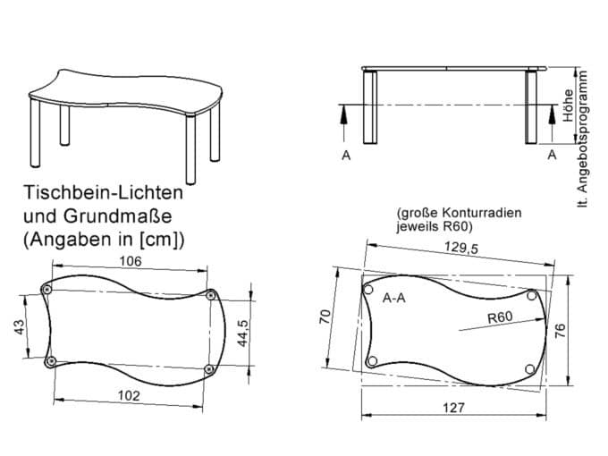 - Einzigartige Wellen-Rechteckform mit konstanten 60 cm Wellenradien schafft harmonische, fließende Arbeitsplätze