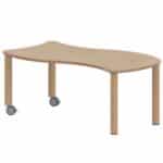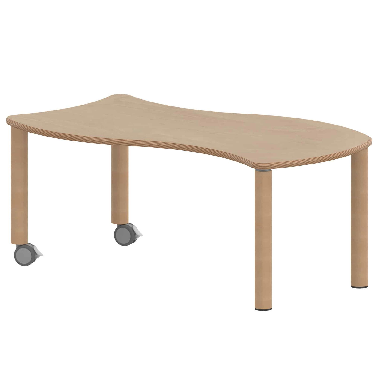 Der Wellen-Rechtecktisch ZALOTTI 120×60 cm mit Schichtstoff-Belag und fahrbaren Massivholzbeinen revolutioniert moderne Arbeits- und Lernumgebungen durch die perfekte Verbindung von organischer Wellenform-Geometrie und cleverer Mobilität. Diese außergewöhnliche zargenlose Tischkonstruktion mit unzerstörbarem 0,8 mm HPL-Schichtstoffbelag und robusten Buche-Massivholzbeinen schafft völlig neue Dimensionen für flexible Gruppenarbeit und spontane Raumgestaltung. Die besondere Wellen-Rechteckform mit 120×60 cm Systemmaß (Stellfläche 126,7×76 cm) und zwei integrierten Rollen ermöglicht müheloses Verschieben für spontane Raumrekonfiguration bei gleichzeitig komfortablem Arbeitsplatz für mittlere Gruppen. Die zargenlose Bauweise bietet ungehinderte Beinfreiheit für alle Nutzer – auch für Rollstuhlfahrer. Mit acht verfügbaren Höhen von 25 bis 76 cm wächst dieser „Made in Germany“ Qualitätstisch flexibel mit den Anforderungen mit und schafft durch seine natürliche Holzoptik eine warme, einladende mobile Arbeitsatmosphäre für kreatives Lernen, gemeinsame Aktivitäten oder innovative Besprechungsformate.