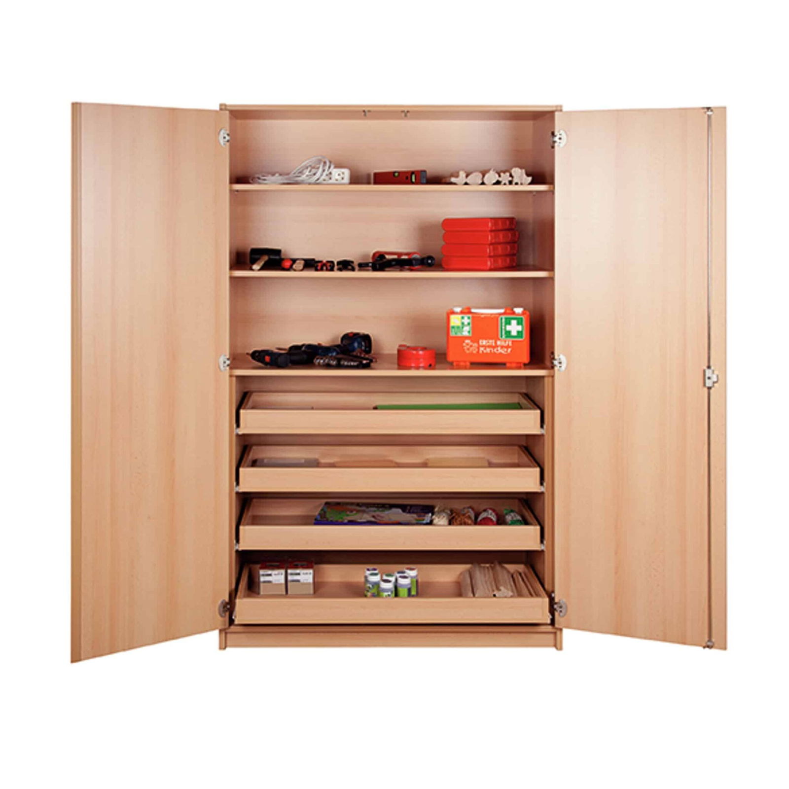 - Das Multitalent für viele Bereiche: Ob als zentraler Material- und Werkzeugschrank im Technikunterricht, als Bastelschrank im Kindergarten oder als vielseitiger Lagerschrank im Büro – seine durchdachte Aufteilung macht ihn zum ultimativen Ordnungshüter für jede Anforderung.