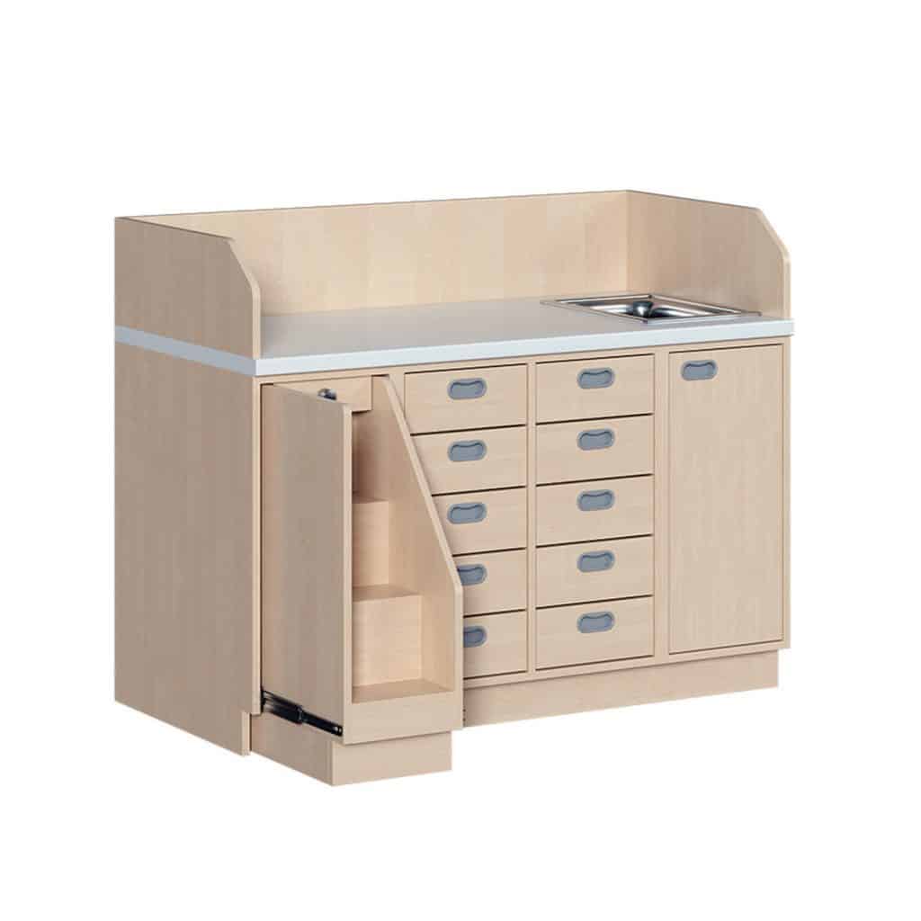 Eine Wickelkommode mit integrierter Treppe macht nicht nur den Kleinsten Spaß, sondern schont zusätzlich Ihren Rücken. Die Treppe kann mittels Rollen und Schienenführung einfach ausgezogen werden und ermöglicht es dem Kind mittels Hilfestellung auf die Kommode zu gelangen, was außerdem die Motorik fördert. Des Weiteren ist sie durch einen Drehgriff einfach zu verriegeln und komplett abschließbar. Das zusätzlich in die wasserabweisende Arbeitsplatze eingelassene Edelstahlwaschbecken ist rostfrei, resistent gegen übliche Haushalts- chemikalien, korrosions- und hitzebeständig. Ablauf und Überlaufgarnitur sind bereits im Lieferumfang enthalten. Neben der Treppe finden unterhalb der Wickelauflage 10 Dekorschübe Platz. Für einen geringen Aufpreis kann je Schub ein Softclose dazu konfiguriert werden. Die Wickelkommode kann mit einer festen Breite von 143 cm in zwei Tiefen (71 oder 91 cm) bestellt werden. Außerdem kann bei der Bestellung die Ausrichtung der Treppe (links oder rechts) konfiguriert werden.
