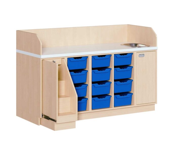 Eine Wickelkommode mit integrierter Treppe macht nicht nur den Kleinsten Spaß, sondern schont zusätzlich Ihren Rücken. Die Treppe kann mittels Rollen und Schienenführung einfach ausgezogen werden und ermöglicht es dem Kind mittels Hilfestellung auf die Kommode zu gelangen, was außerdem die Motorik fördert. Des Weiteren ist sie durch einen Drehgriff einfach zu verriegeln und komplett abschließbar. Das zusätzlich in die wasserabweisende Arbeitsplatze eingelassene Edelstahlwaschbecken ist rostfrei, resistent gegen übliche Haushalts- chemikalien, korrosions- und hitzebeständig. Ablauf und Überlaufgarnitur sind bereits im Lieferumfang enthalten. Neben der Treppe finden unterhalb der Wickelauflage zusätzlich 12 hohe ErgoTrayboxen ihren Platz. Die Wickelkommode kann mit einer festen Breite von 179 cm in zwei Tiefen (71 oder 91 cm) bestellt werden. Außerdem kann bei der Bestellung die Ausrichtung der Treppe (links oder rechts) konfiguriert werden.