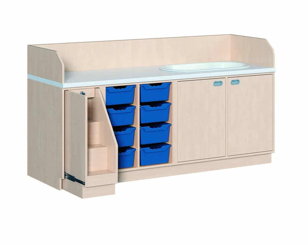 Eine Wickelkommode mit integrierter Treppe macht nicht nur den Kleinsten Spaß, sondern schont zusätzlich Ihren Rücken. Die Treppe kann mittels Rollen und Schienenführung einfach ausgezogen werden und ermöglicht es dem Kind mittels Hilfestellung auf die Kommode zu gelangen, was außerdem die Motorik fördert. Des Weiteren ist sie durch einen Drehgriff einfach zu verriegeln und komplett abschließbar. Die zusätzlich in die wasserabweisende Arbeitsplatze eingelassene Acryl-Badewanne ist für Säuglinge und Kinder geeignet. Sie wird mit Ablauf und Überlaufgarnitur geliefert. Neben der Treppe finden unterhalb der Wickelauflage zusätzlich 8 hohe ErgoTrayboxen ihren Platz. Die Wickelkommode kann mit einer festen Breite von 249 cm in zwei Tiefen (71 oder 91 cm) bestellt werden. Außerdem kann bei der Bestellung die Ausrichtung der Treppe (links oder rechts) konfiguriert werden.