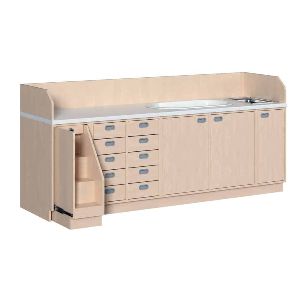 Eine Wickelkommode mit integrierter Treppe macht nicht nur den Kleinsten Spaß, sondern fördert außerdem deren Motorik. Des Weiteren ist sie durch einen Drehgriff einfach zu verriegeln und komplett abschließbar. Die zusätzlich in die wasserabweisende Arbeitsplatze eingelassene Acryl-Badewanne ist für Säuglinge und Kinder geeignet. Der Wickeltisch verfügt außerdem über ein Edelstahlwaschbecken, welches rostfrei, resistent gegen übliche Haushalts- chemikalien, korrosions- und hitzebeständig ist. Badewanne sowie Waschbecken beinhalten im Lieferumfang Ablauf und Überlaufgarnitur. Neben der Treppe finden unterhalb der Wickelauflage 10 Dekorschübe Platz. Für einen geringen Aufpreis kann je Schub ein Softclose dazu konfiguriert werden. Die Wickelkommode kann mit einer festen Breite von 249 cm in zwei Tiefen (71 oder 91 cm) bestellt werden. Außerdem kann bei der Bestellung die Ausrichtung der Treppe (links oder rechts) konfiguriert werden.
