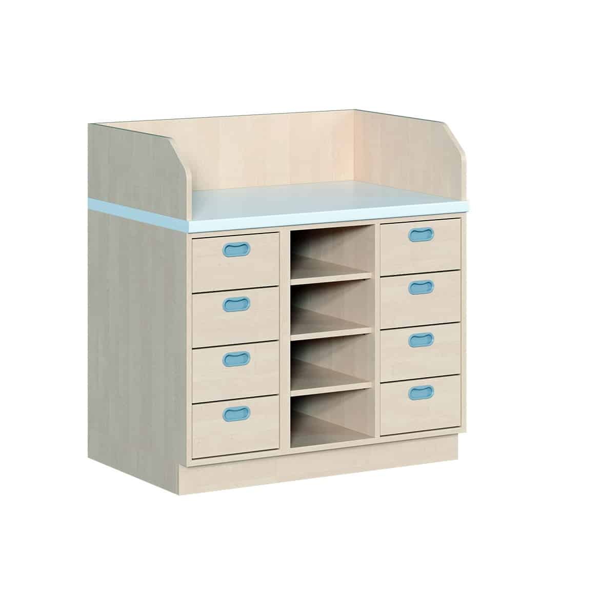 Entdecken Sie die Wickelkommode dreireihig mit 8 Dekorschüben und Regal – die intelligente Lösung für professionelle Babypflege mit durchdachter Organisation und perfekter Arbeitseffizienz. Diese vielseitige Komplettlösung vereint auf kompakten 1,07 Metern Breite alles, was moderne Pflegestationen auszeichnet: einen sicheren, ergonomischen Wickelbereich und ein innovatives Mischsystem aus 8 praktischen Dekorschüben für sofortigen Zugriff und einem offenen Regalbereich mit 3 verstellbaren Einlegeböden für transparente Übersicht. Mit frontbündigen Griffen in hochwertiger Aluminiumoptik und robuster Melaminplatte-Konstruktion bietet diese Wickelkommode die perfekte Balance zwischen geschützter Organisation und offener Sichtbarkeit für kleinere Krippen und Kindergärten. Die wasserfeste 3,8 cm dicke Arbeitsplatte mit dreiseitiger Sicherheitsaufkantung schafft optimale Bedingungen für entspannte, sichere Pflegesituationen bei gleichzeitig flexibler Aufbewahrung aller Pflegeutensilien.