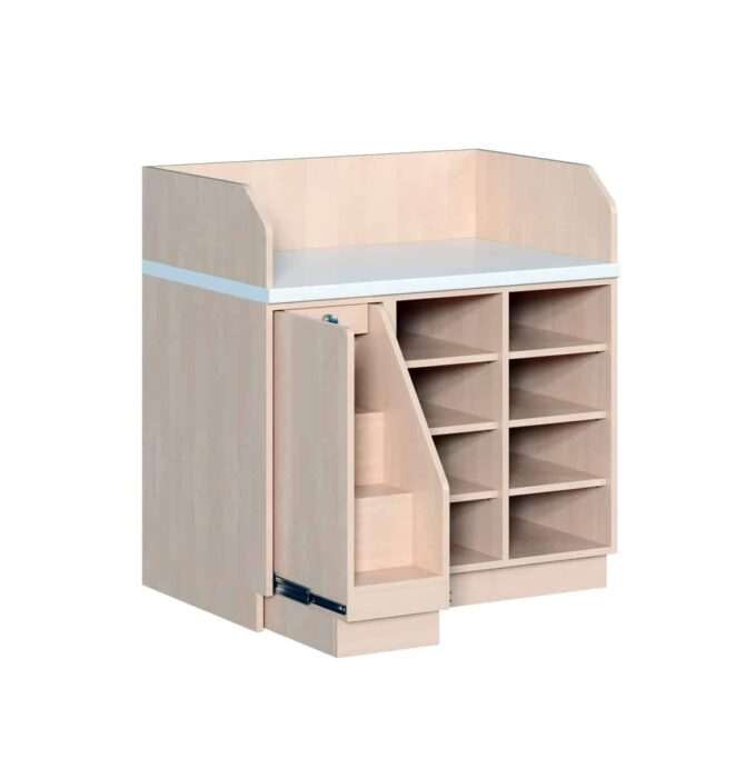 Wickelkommode dreireihig – mit Regal und Aufstiegshilfe – Transparente Organisation für kompakte Pflegebereiche
