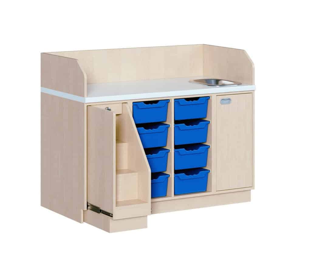 Wickelkommode dreireihig mit Waschbecken – 8 ErgoTray-Boxen und Aufstiegshilfe – Ergonomie trifft auf hygienische Perfektion