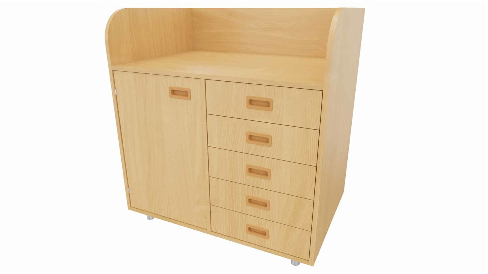Unsere Wickelkommode mit linksseitiger Tür, 2 verstellbaren Böden und rechtsseitigen 5 Schubkästen im Dekor Buche bietet Ihnen eine durchdachte und funktionale Lösung für Ihre Wickelräume. Diese vielseitige Kommode ist ideal für Kindergärten, Kitas und andere pädagogische Einrichtungen und sorgt für optimale Organisation und schnellen Zugriff auf alle wichtigen Utensilien.