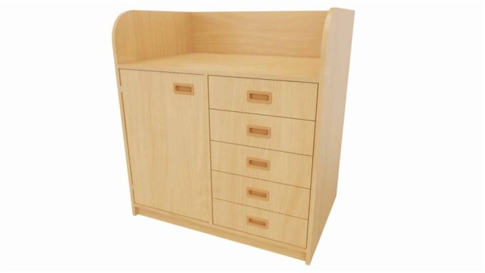 Unsere Wickelkommode mit linksseitiger Tür, 2 verstellbaren Böden und rechtsseitigen 5 Schubkästen im Dekor Buche bietet Ihnen eine durchdachte und funktionale Lösung für Ihre Wickelräume. Diese vielseitige Kommode ist ideal für Kindergärten, Kitas und andere pädagogische Einrichtungen und sorgt für optimale Organisation und schnellen Zugriff auf alle wichtigen Utensilien.