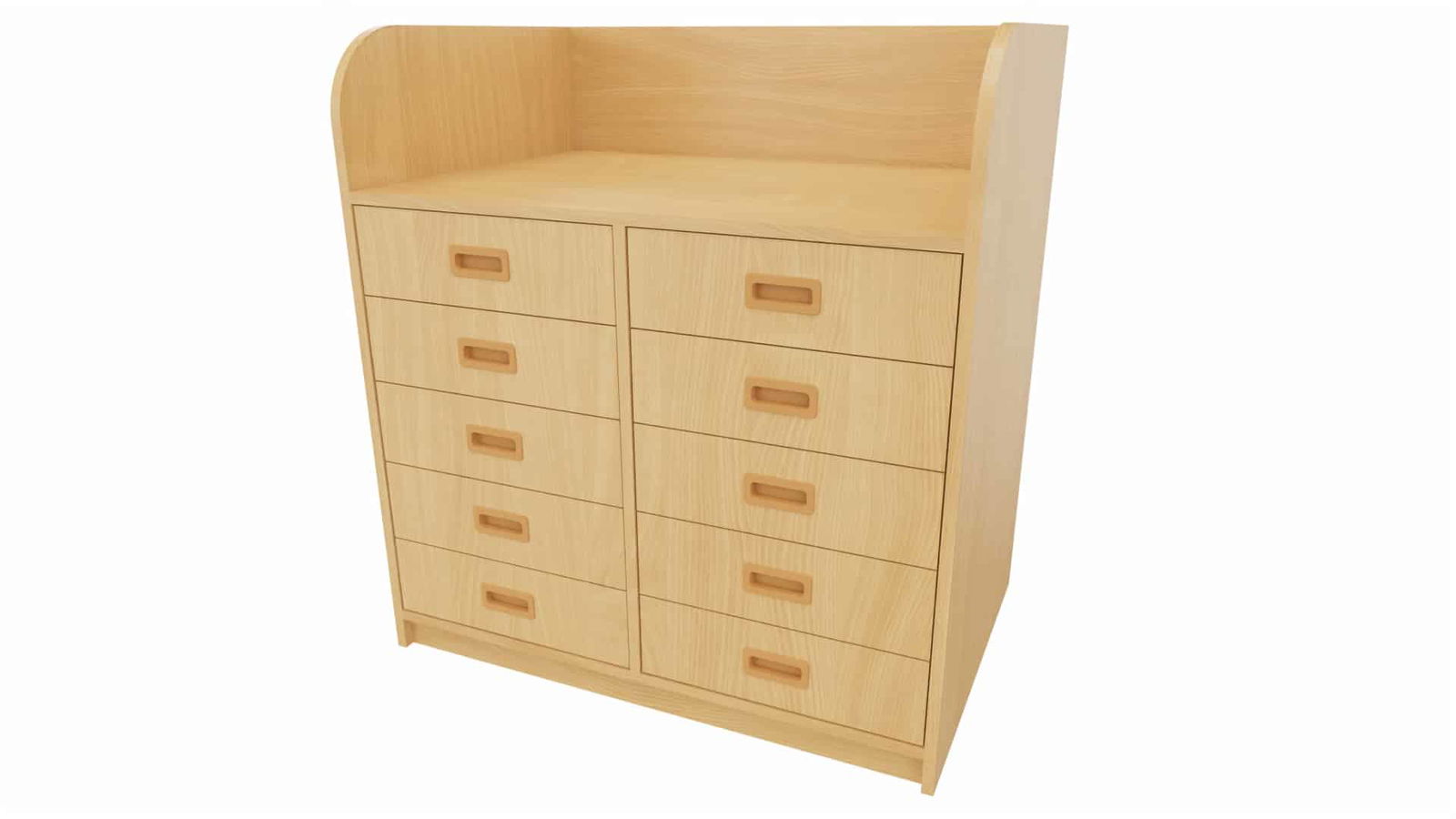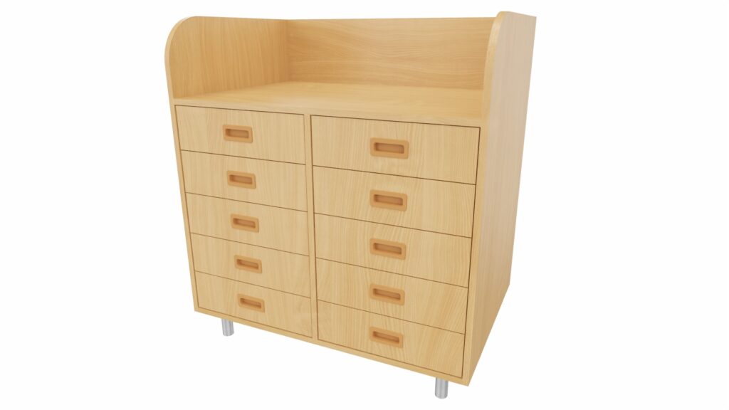 Unsere Wickelkommode mit Aufkantung (25 cm hoch) und 10 Schubkästen im Dekor Buche bietet Ihnen eine durchdachte und vielseitige Lösung für Ihre Wickelräume. Diese praktische Kommode ist ideal für Kindergärten, Kitas und andere pädagogische Einrichtungen und sorgt für optimale Organisation und schnellen Zugriff auf alle Wickelutensilien.