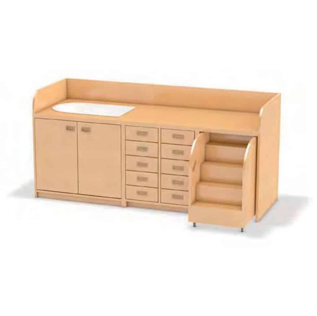 - Ausstattung: Links Badewannenschrank mit Säuglingsbadewanne und Doppeltür, mittig 10 geräumige Schubkästen, rechts ausziehbare Treppe (oder optional links)