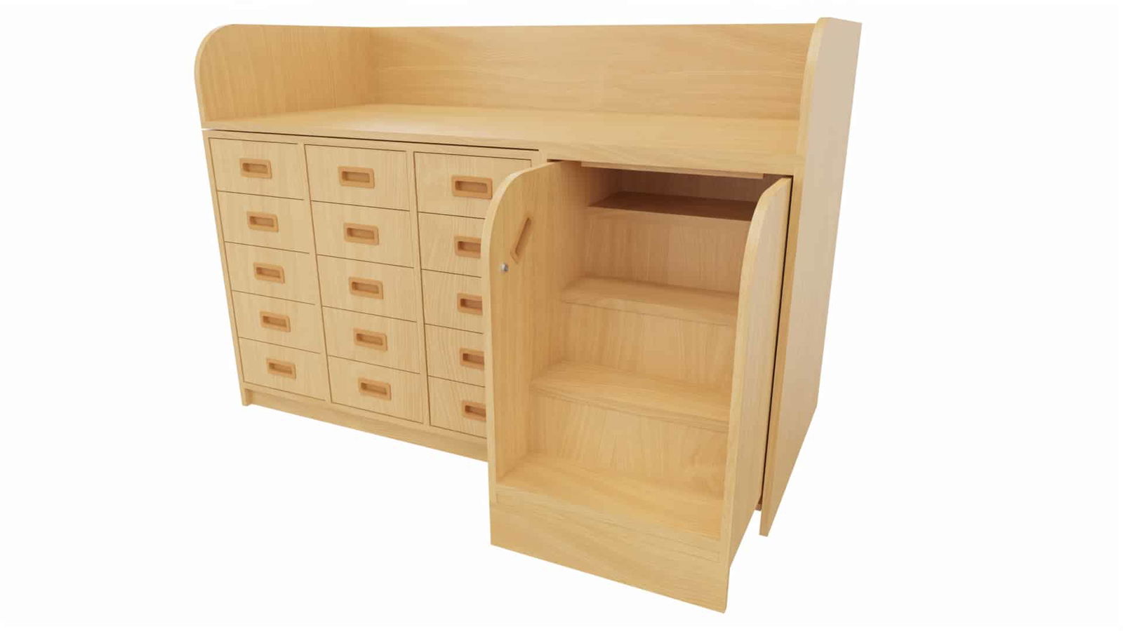 Unsere Wickelkommode mit ausziehbarer Treppe und 15 Schubkästen im Dekor Buche bietet Ihnen eine durchdachte und vielseitige Lösung für Ihre Wickelräume. Diese hochwertige und praktische Wickelanlage ist ideal für Kindergärten, Kitas und andere pädagogische Einrichtungen, um eine sichere und angenehme Wickelzeit zu gewährleisten.