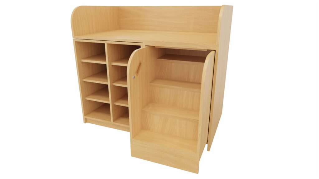 Unsere Wickelkommode mit ausziehbarer Treppe und Regal mit Mittelwand im Dekor Buche bietet Ihnen eine durchdachte und vielseitige Lösung für Ihre Wickelräume. Diese hochwertige und praktische Wickelanlage ist ideal für Kindergärten, Kitas und andere pädagogische Einrichtungen, um eine sichere und angenehme Wickelzeit zu gewährleisten.