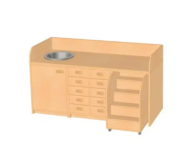 Unsere Wickelkommode mit ausziehbarer Treppe, Waschbeckenschrank mit Tür, Waschbecken aus Edelstahl und 10 Schubkästen im Dekor Buche bietet eine durchdachte und vielseitige Lösung für Ihre Wickelräume. Diese hochwertige Wickelanlage ist ideal für Kindergärten, Kitas und andere pädagogische Einrichtungen, um eine angenehme und sichere Wickel- und Pflegezeit zu gewährleisten.