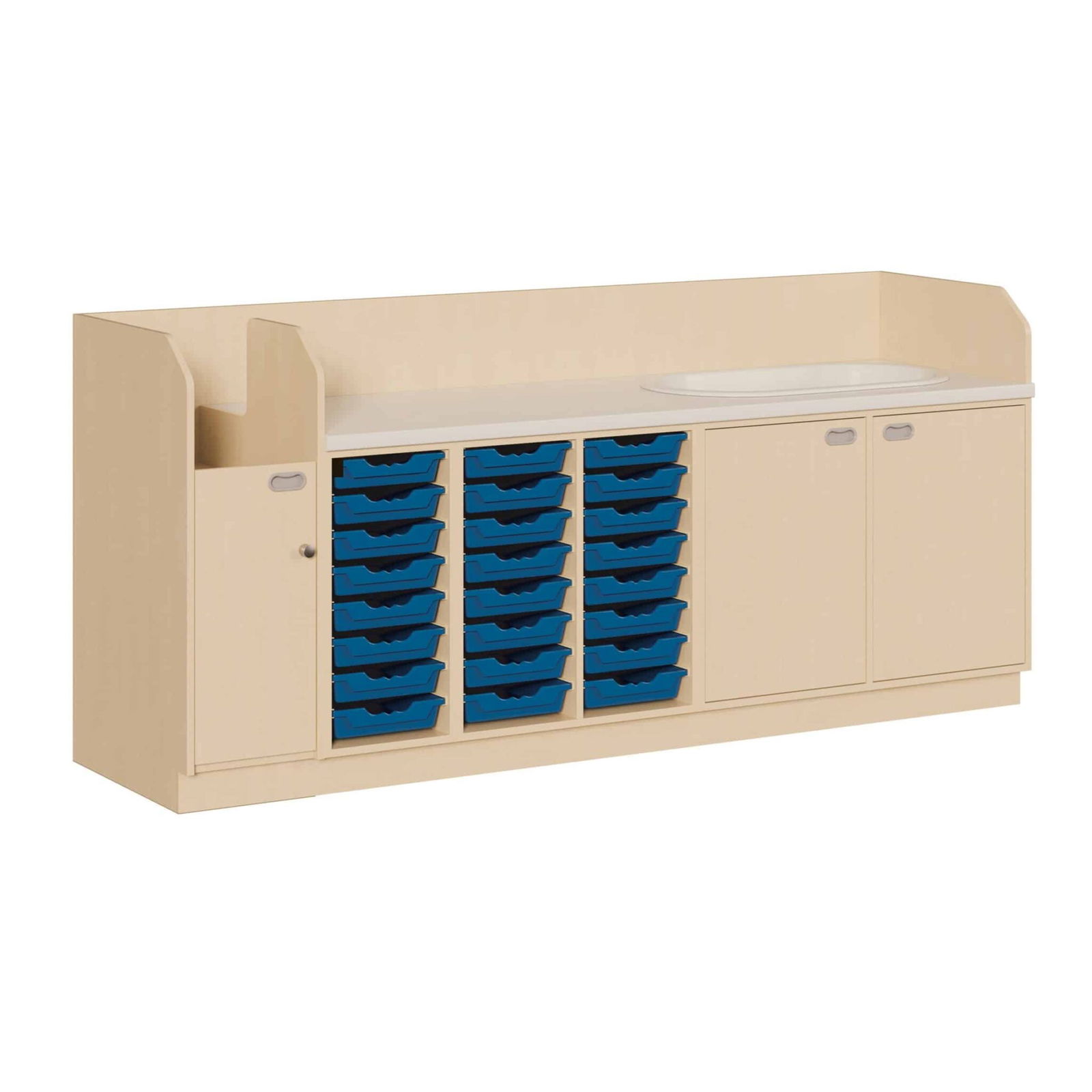 Eine Wickelkommode mit integrierter Treppe macht nicht nur den Kleinsten Spaß, sondern schont zusätzlich Ihren Rücken. Sie ermöglicht es dem Kind mittels Hilfestellung auf die Kommode zu krabbeln und fördert gleichzeitig die Motorik sowie den Gleichgewichtssinn. Die Treppe kann durch ein Sicherheitsschloss verriegelt werden. Die zusätzlich in die wasserabweisende Arbeitsplatze eingelassene Acryl-Badewanne ist für Säuglinge und Kinder geeignet. Sie wird mit Ablauf und Überlaufgarnitur geliefert. Neben der Treppe finden unterhalb der Wickelauflage zusätzlich 24 flache ErgoTrayboxen ihren Platz. Die Wickelkommode kann mit einer festen Breite von 249 cm in zwei Tiefen (71 oder 91 cm) bestellt werden. Außerdem kann bei der Bestellung die Ausrichtung der Treppe (links oder rechts) konfiguriert werden.