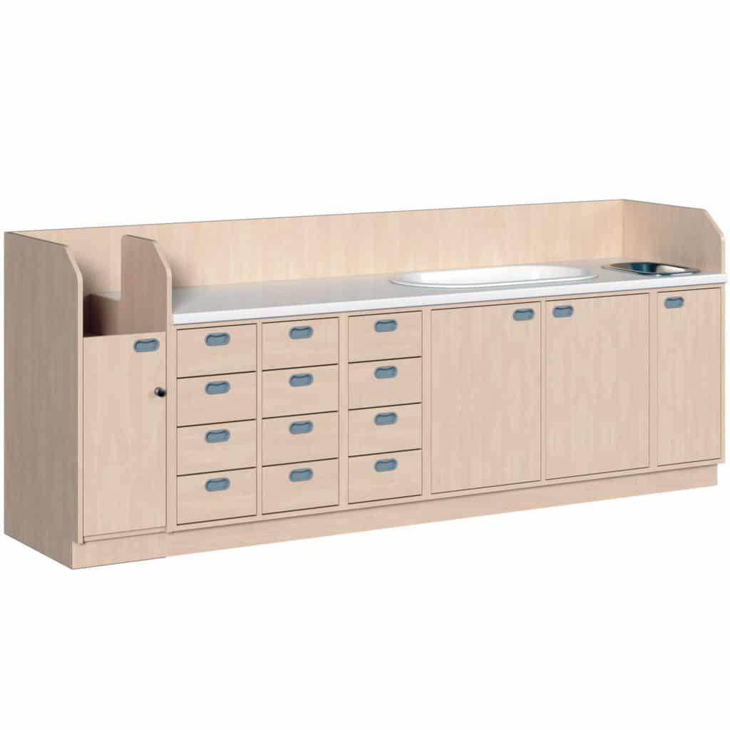 Wickelkommode mit verschließbaren Treppenaufgang, Badewanne, Waschbecken und 12 Dekorschüben