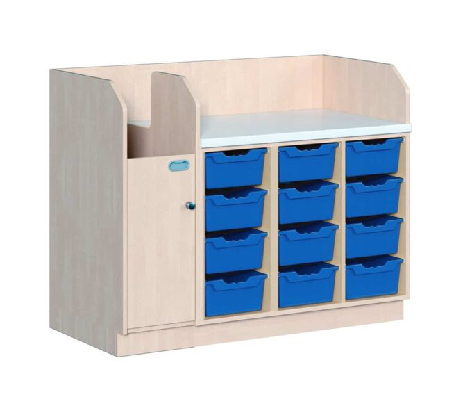 Eine Wickelkommode mit integrierter Treppe macht nicht nur den Kleinsten Spaß, sondern schont zusätzlich Ihren Rücken. Sie ermöglicht es dem Kind mittels Hilfestellung auf die Kommode zu krabbeln und fördert gleichzeitig die Motorik sowie den Gleichgewichtssinn. Die Treppe kann durch ein Sicherheitsschloss verriegelt werden. Neben der Treppe finden unterhalb der Wickelauflage zusätzlich 12 hohe ErgoTrayboxen ihren Platz. Die Wickelkommode kann mit einer festen Breite von 143 cm in zwei Tiefen (71 oder 91 cm) bestellt werden. Außerdem kann bei der Bestellung die Ausrichtung der Treppe (links oder rechts) konfiguriert werden.