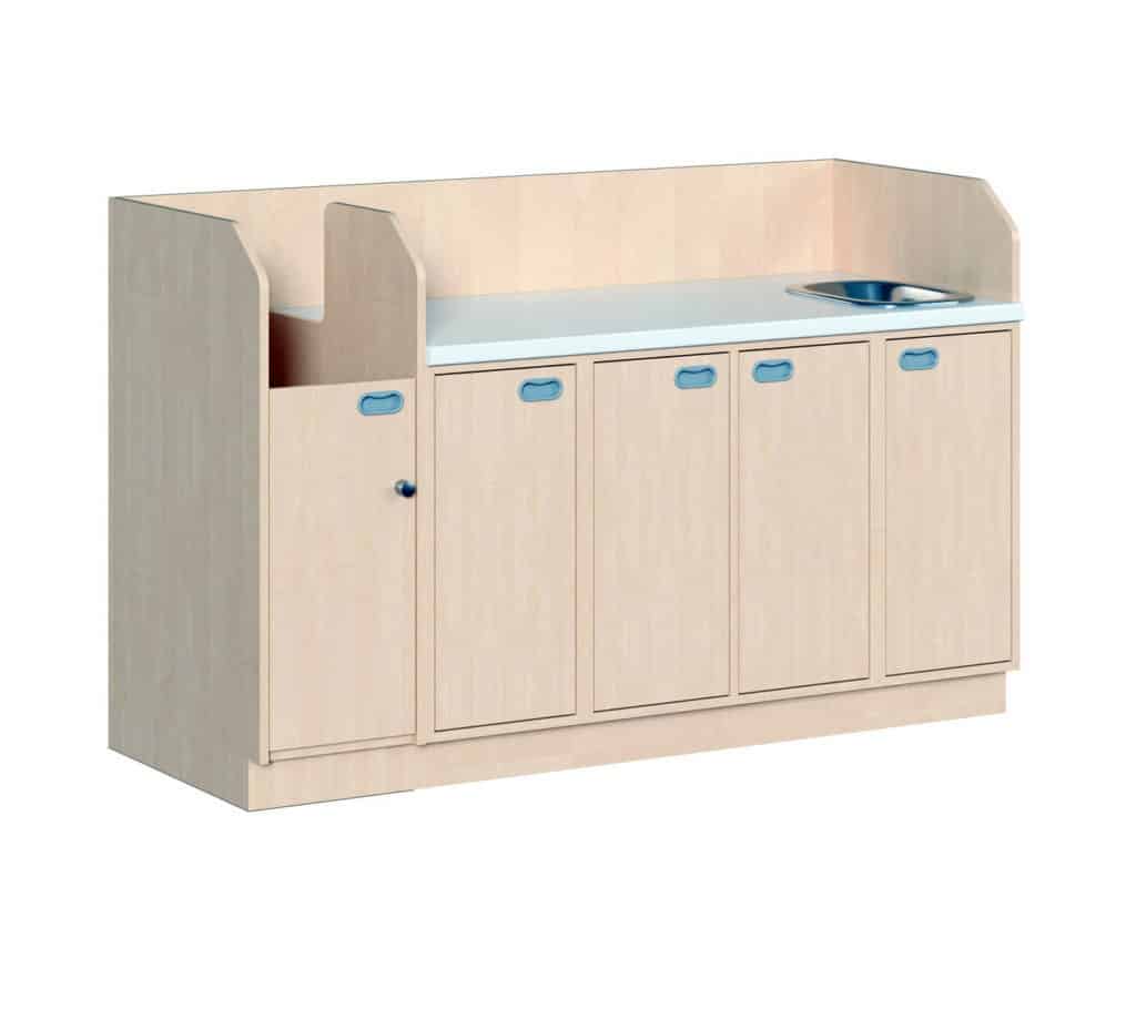 Eine Wickelkommode mit integrierter Treppe macht nicht nur den Kleinsten Spaß, sondern schont zusätzlich Ihren Rücken. Sie ermöglicht es dem Kind mittels Hilfestellung auf die Kommode zu krabbeln und fördert gleichzeitig die Motorik sowie den Gleichgewichtssinn. Die Treppe kann durch ein Sicherheitsschloss verriegelt werden. Das zusätzlich in die wasserabweisende Arbeitsplatze eingelassene Edelstahlwaschbecken ist rostfrei, resistent gegen übliche Haushalts- chemikalien, korrosions- und hitzebeständig. Ablauf und Überlaufgarnitur sind bereits im Lieferumfang enthalten. Neben der Treppe finden unterhalb der Wickelauflage, mittels dreier Türen, verschließbare Regalfächer ihren Platz, welche zusätzlichen Stauraum mit sich bringen. Die Wickelkommode kann mit einer festen Breite von 179 cm in zwei Tiefen (71 oder 91 cm) bestellt werden. Außerdem kann bei der Bestellung die Ausrichtung der Treppe (links oder rechts) konfiguriert werden.