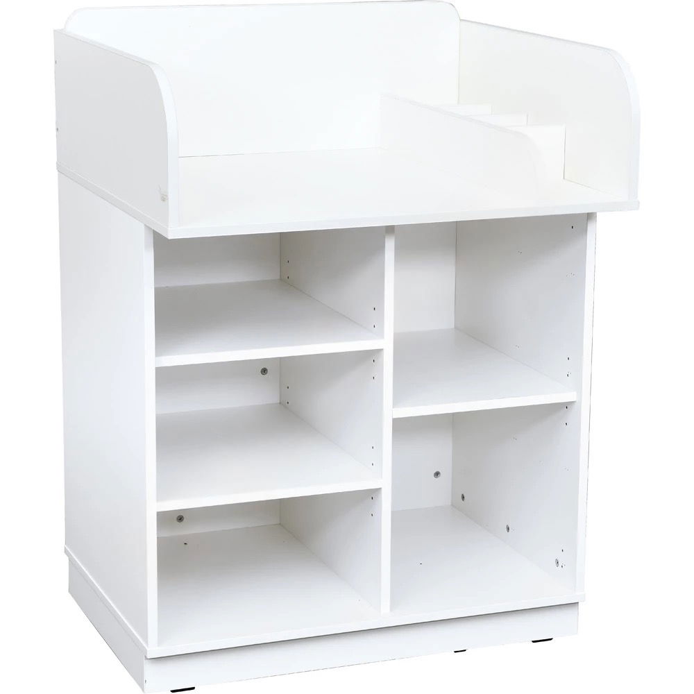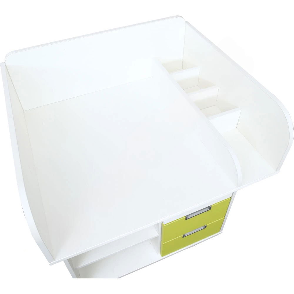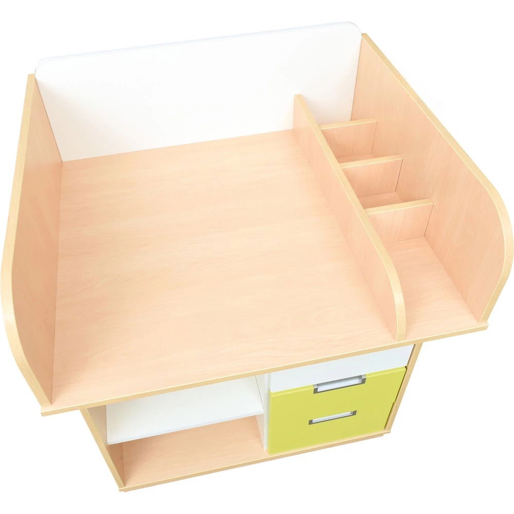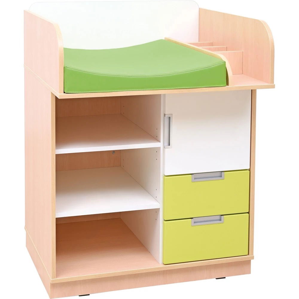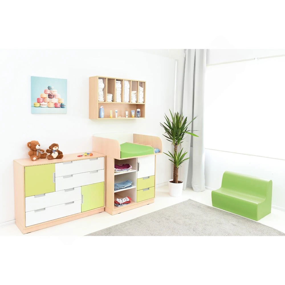 Mit einer komfortablen Arbeitshöhe von 86,5 cm ermöglicht die Kommode eine aufrechte und entspannte Körperhaltung. Dies ist eine wichtige ergonomische Entlastung für Erzieherinnen und Erzieher, die diese Aufgabe täglich mehrfach ausführen und so ihren Rücken schonen können. - Langlebige Qualität für den intensiven Kita-Alltag