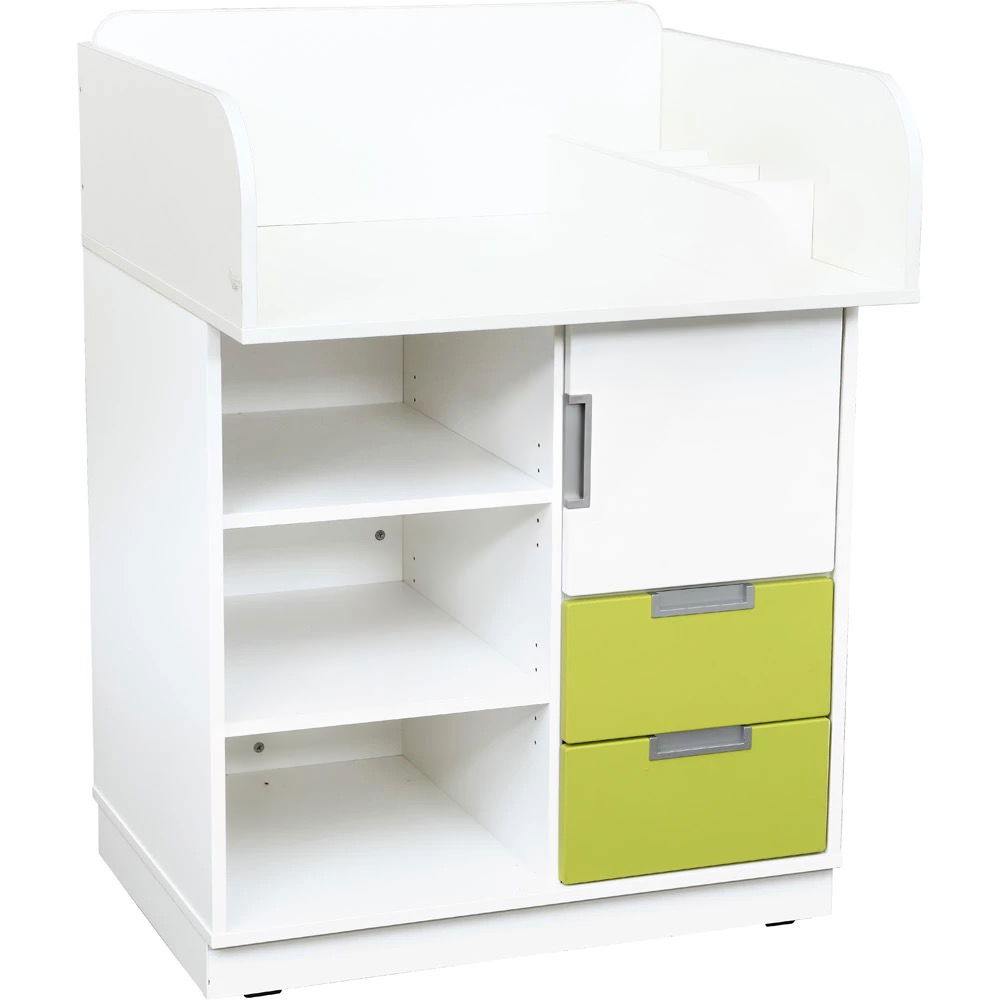 Beim Wickeln muss alles schnell zur Hand sein. Die Quadro-Kommode bietet eine clevere Aufteilung für alle Utensilien: In den zwei oberen Schubladen lassen sich kleinere Gegenstände wie Cremes, Kämme oder Thermometer übersichtlich verstauen. Das große offene Fach darunter ist ideal für Windelpakete und Feuchttücher. Hinter der Schranktür findet größere Wechselkleidung oder ein Vorrat an Handtüchern Platz. Alles ist in direkter Reichweite und sorgt für effiziente Abläufe. - Ergonomische Arbeitshöhe für rückenschonendes Arbeiten