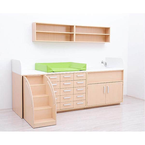 Wickelkommodenlandschaft 1 besteht aus Treppe, Wickelkommode mit 15 Schubladen, Badewannen- oder Waschbeckenschrank mit Wanne (oder Becken) und durchgehender Arbeitsplatte; inklusive Armatur und Wickelauflage. Die auf dem Foto abgebildeten Hängeregale sind im Preis nicht enthalten