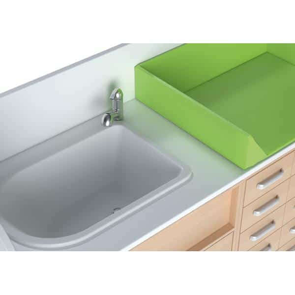 Wickelkommodenlandschaft 4 besteht aus Treppe, Wickelkommode mit 15 Schubladen, Badewannen- oder Waschbeckenschrank mit Wanne (oder Becken) und durchgehender Arbeitsplatte; inklusive Armatur und Wickelauflage.