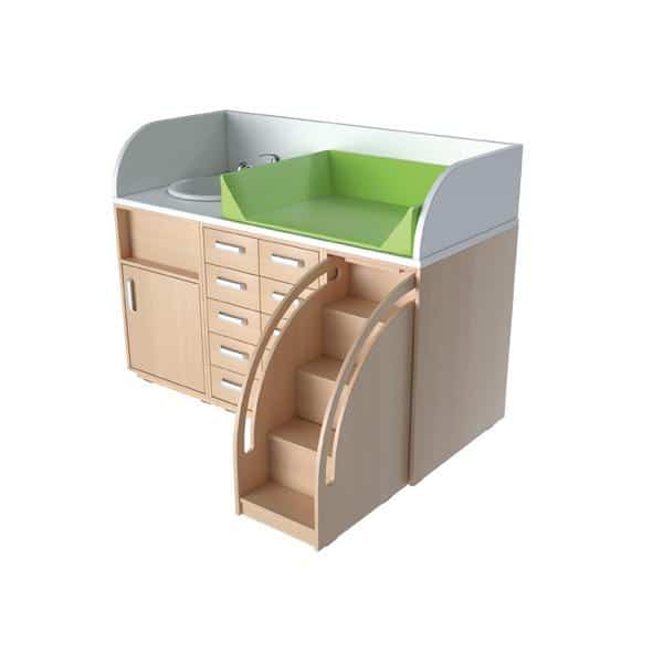 Wickelkommodenlandschaft 5 besteht aus Treppe, Wickelkommode mit 10 Schubladen, Badewannen- oder Waschbeckenschrank mit Wanne (oder Becken) und durchgehender Arbeitsplatte; inklusive Armatur und Wickelauflage.