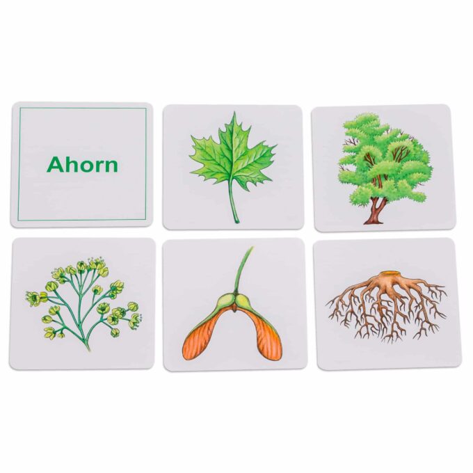 Die Lernkarten enthalten Informationen zu 9 verschiedenen Baumarten: Ahorn, Buche, Birke, Eiche, Fichte, Kastanie, Kiefer, Linde und Tanne. Anders als bei herkömmlichen Lehrmitteln wird hier eine dynamische und spannende Lernmethode verwendet. Die Kinder können Bilder und Texte vergleichen, um ihr Wissen zu erweitern und mehr über die Natur um sie herum zu erfahren.