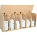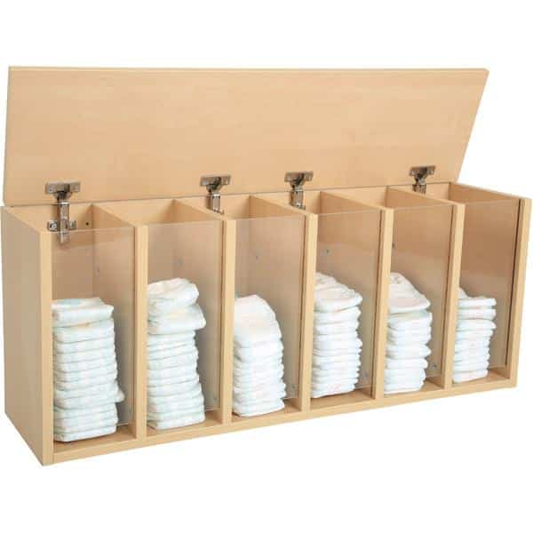 Windelregal mit 6 Fächern. Ideal zur Montage über einem Wickeltisch. In jedes Fach passen ca. 20 Windeln; Front aus Plexiglas sorgt für Durchblick bei der Mengenkontrolle und schützt vorm Herausfallen der Windeln; Öffnung unten zur Entnahme. Deckelklappe mit Scharnieren und Sicherung gegen ungewolltes Zuklappen.