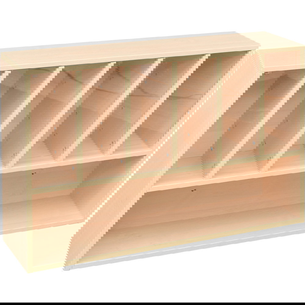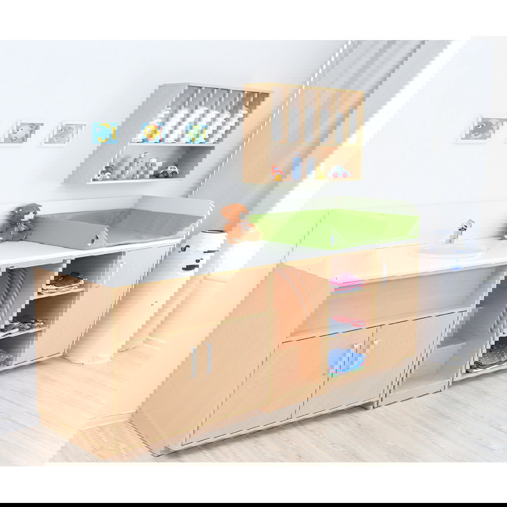 Gefertigt aus 18 mm starker, laminierter Spanplatte, ist das Regal äußerst stabil und langlebig. Die Oberfläche in Ahorn-Optik ist unempfindlich gegenüber Feuchtigkeit und lässt sich mühelos abwischen und desinfizieren – ein Muss für hygienische Standards im Wickelbereich.